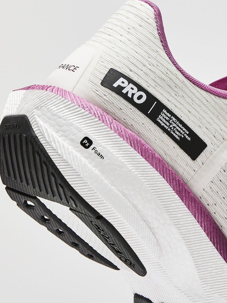 Craft PRO Endur Distance nedisponuje karbonovým plátem. Díky tomu sice nemá tuhost potřebnou pro dosažení nejvyšší možné rychlosti, ale o to všestrannější tato bota je. Agresivní geometrie vybízející k dopadu na střed chodidla v kombinaci s energetickou pěnou PX foam zajistí příjemně svižný odpich i při intervalech, tempovém tréninku, nebo delším závodě. Vyšší měkkost je dostatečně šetrná k vašim chodidlům a achilovkám, takže se PRO Endur Distance skvěle hodí pro každodenní nabíhání kilometrů.