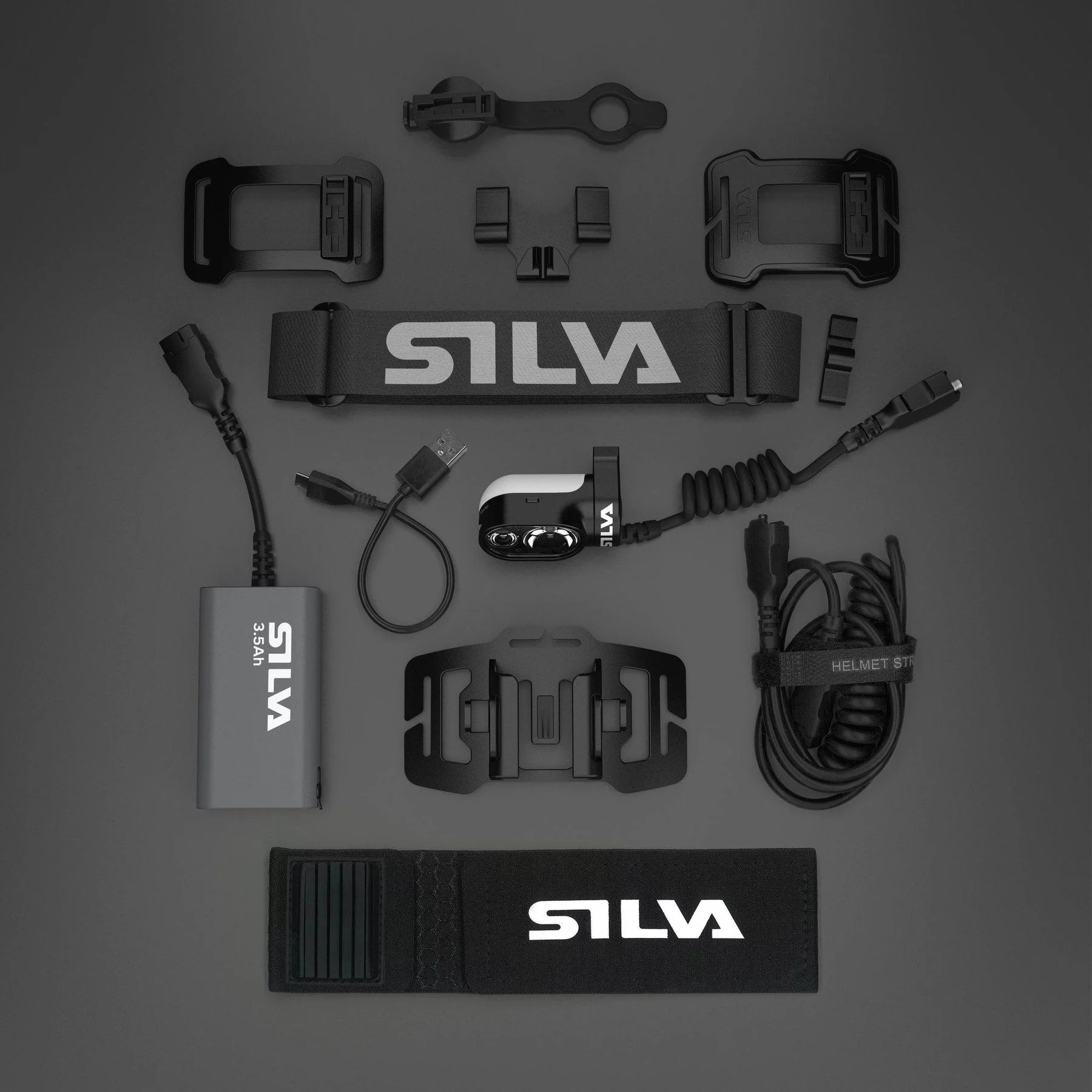 Obsah balení Cross Trail 7XT: reflektor, elastická čelenka, držák na reflektor a na baterii, adaptér na řídítka kola, elastický popruh na baterii, držák na helmu, prodlužovací kabel 80 cm, USB-C Li-Ion nabíjecí baterie 25,9Wh, USB-C nabíjecí kabel