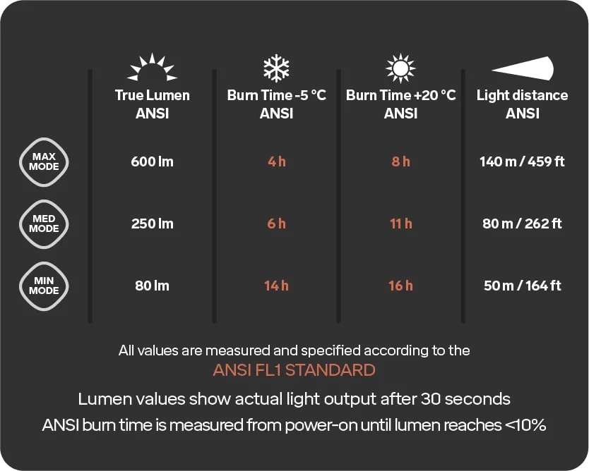 | 600 lm | 140 m | 8 h |