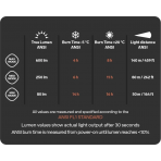 * Technické parametry čelovek Silva jsou měřeny podle normy ANSI FL1. Čas výdrže baterie je udáván jako doba, do které klesne světelný výkon na 10% počáteční hodnoty změřené 30 vteřin po zapnutí, nejedná se o čas úplného vybití, po té přejde čelovka do rezervního módu. Výdrž baterie je ovlivněna okolní teplotou a druhem aktivity, např. při běhu nebo jízdě na kole, je reflektor lépe chlazen, mínusové teploty naopak ubírají baterii na kapacitě. Dosvit se uvádí jako vzdálenost, na které poklesne intenzita osvětlení na hodnotu 0,25luxu. To je přibližně intenzita osvětlení , kterou vytváří Měsíc v úplňku za jasné oblohy.