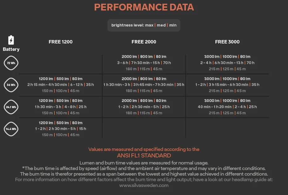 * Technické parametry čelovek Silva jsou měřeny podle normy ANSI FL1. Čas výdrže baterie je udáván jako doba, do které klesne světelný výkon na 10% počáteční hodnoty změřené 30 vteřin po zapnutí, nejedná se o čas úplného vybití, po té přejde čelovka do rezervního módu. Výdrž baterie je ovlivněna okolní teplotou a druhem aktivity, např. při běhu nebo jízdě na kole, je reflektor lépe chlazen, mínusové teploty naopak ubírají baterii na kapacitě. Dosvit se uvádí jako vzdálenost, na které poklesne intenzita osvětlení na hodnotu 0,25luxu. To je přibližně intenzita osvětlení , kterou vytváří Měsíc v úplňku za jasné oblohy.