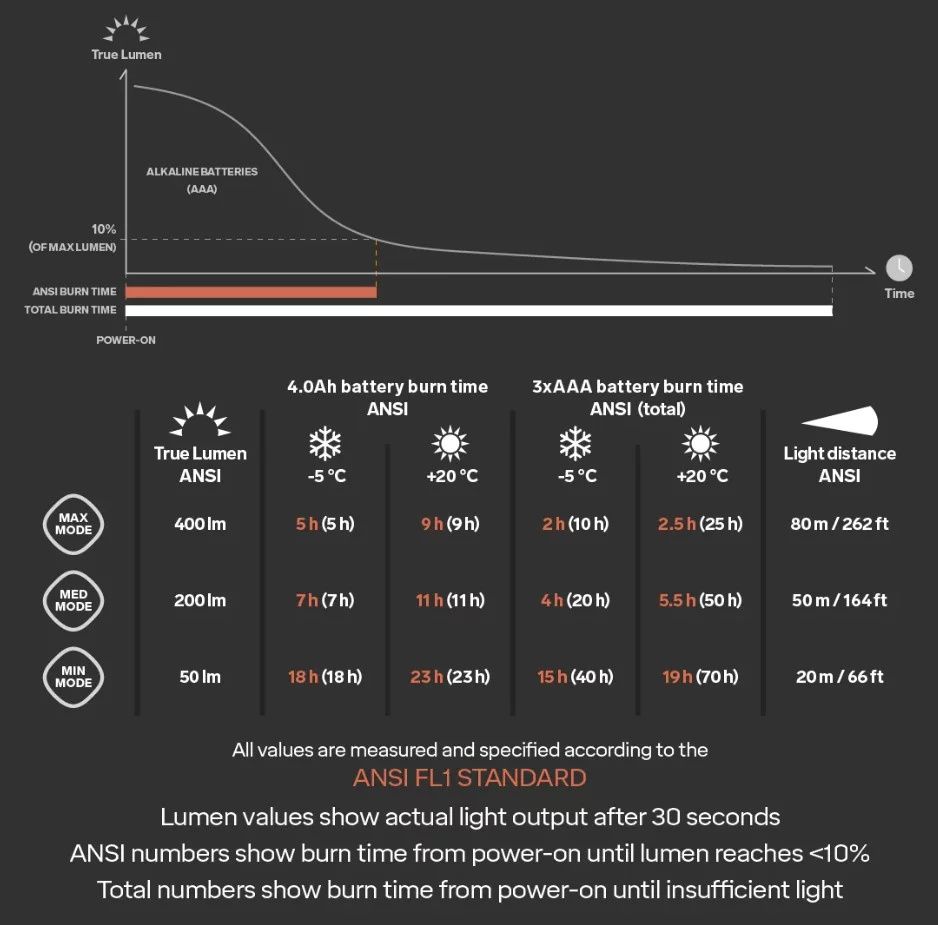 * Technické parametry čelovek Silva jsou měřeny podle normy ANSI FL1. Čas výdrže baterie je udáván jako doba, do které klesne světelný výkon na 10% počáteční hodnoty změřené 30 vteřin po zapnutí, nejedná se o čas úplného vybití, po té přejde čelovka do rezervního módu. Výdrž baterie je ovlivněna okolní teplotou a druhem aktivity, např. při běhu nebo jízdě na kole, je reflektor lépe chlazen, mínusové teploty naopak ubírají baterii na kapacitě. Dosvit se uvádí jako vzdálenost, na které poklesne intenzita osvětlení na hodnotu 0,25luxu. To je přibližně intenzita osvětlení , kterou vytváří Měsíc v úplňku za jasné oblohy.