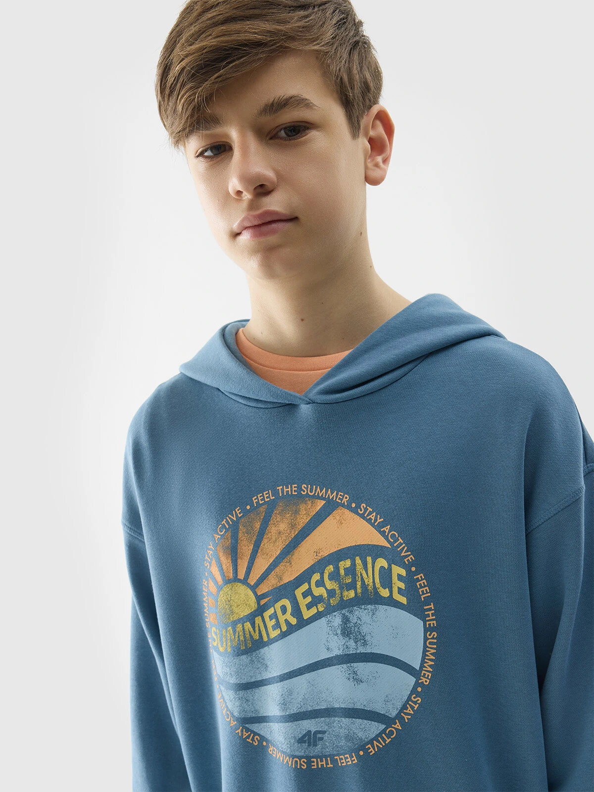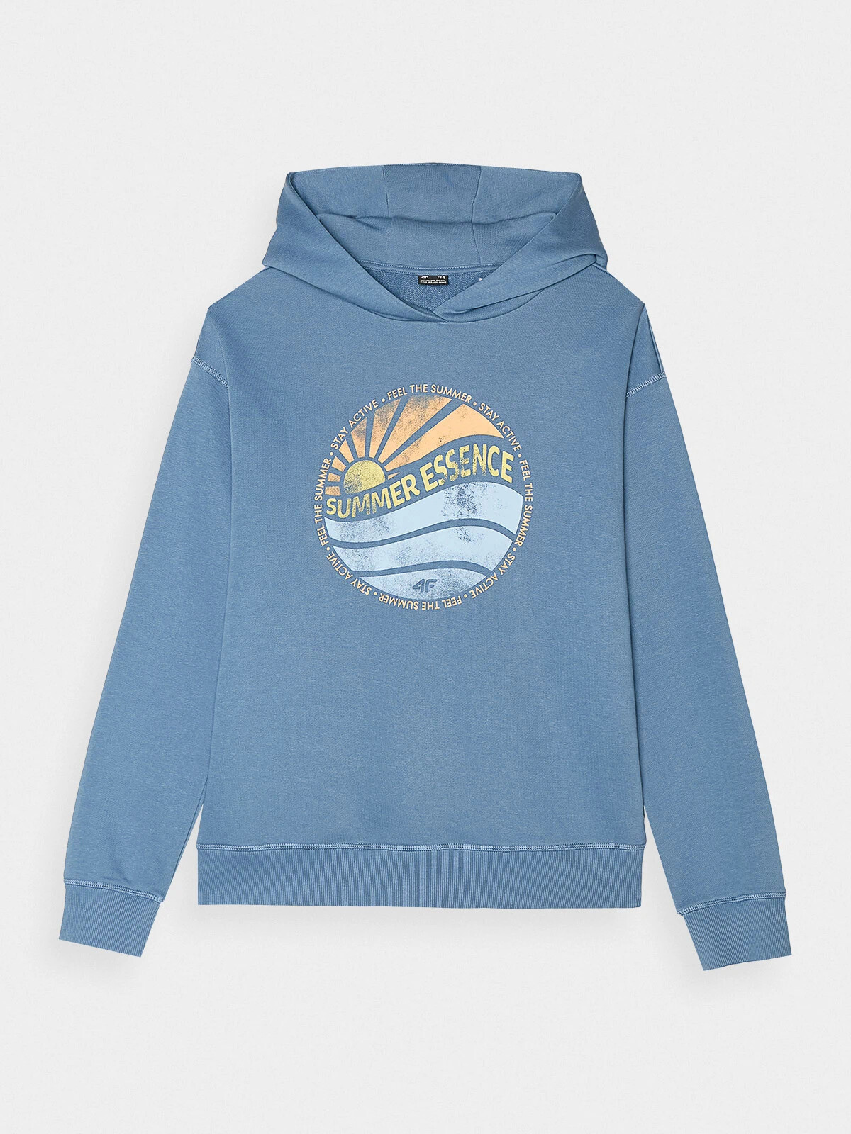 Na přední straně je výrazný potisk s motivem slunce a vln a nápisem "Feel the Summer. Stay Active. Summer Essence". Klasický střih bez kapes. Mikina přes hlavu. Spodní část s širokým lemem.