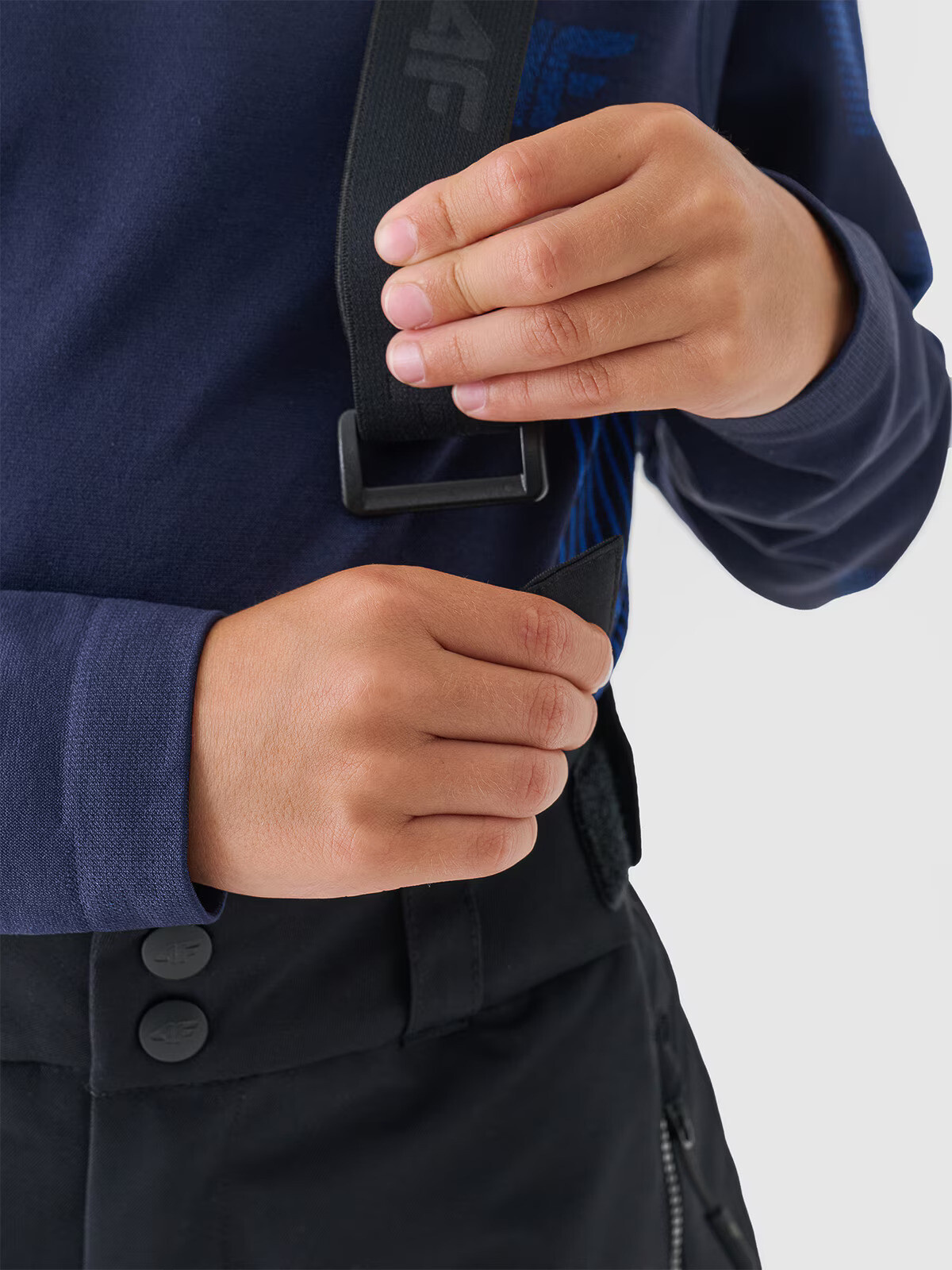 Chlapecké zimní kalhoty mají na bocích 2 kapsy na zip. Pás s trojitým zapínáním na zip, suchý zip a patentky. Na bocích jsou navíc pásky na suchý zip, které umožňují přesné přizpůsobení v pase. Poutka na pásku umožňují nošení dalšího pásku nebo připevnění drobných doplňků.