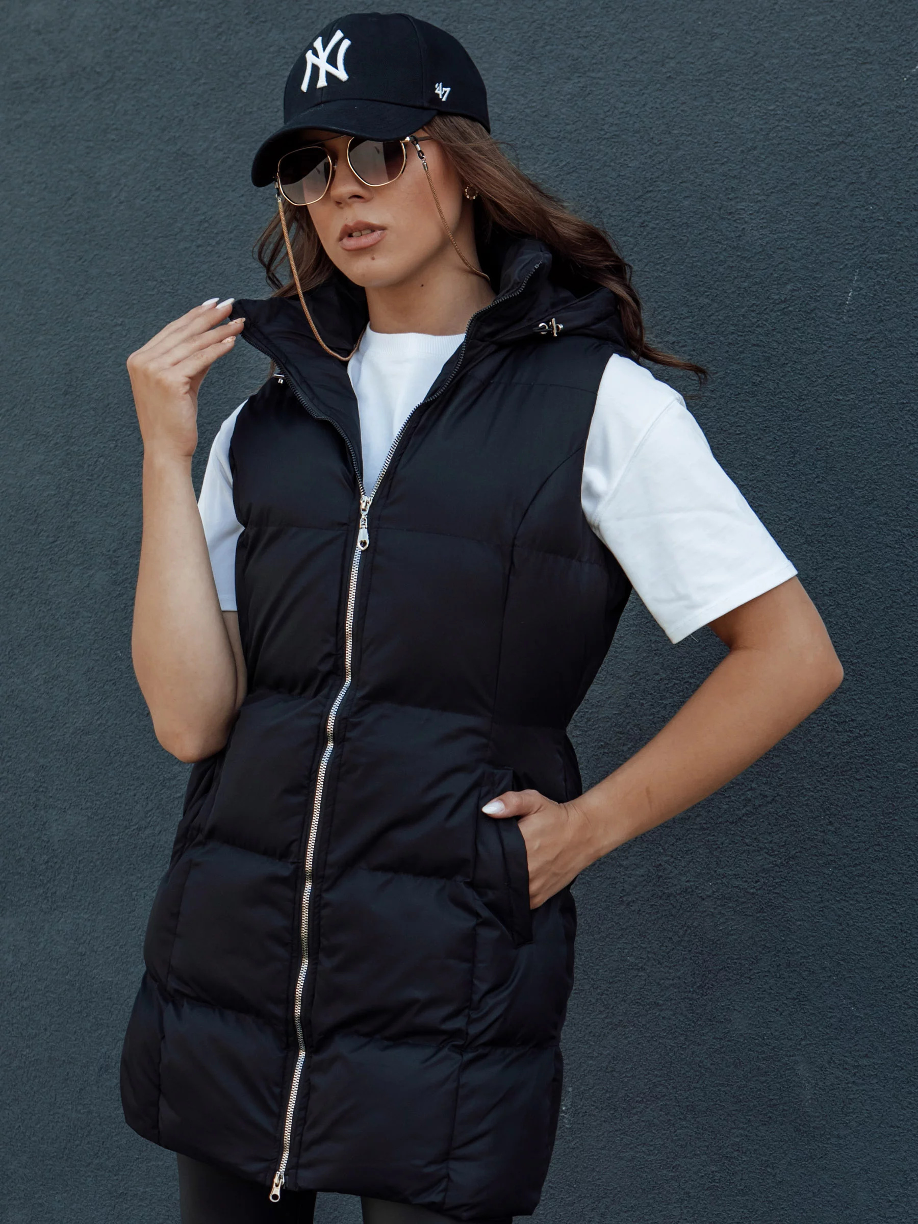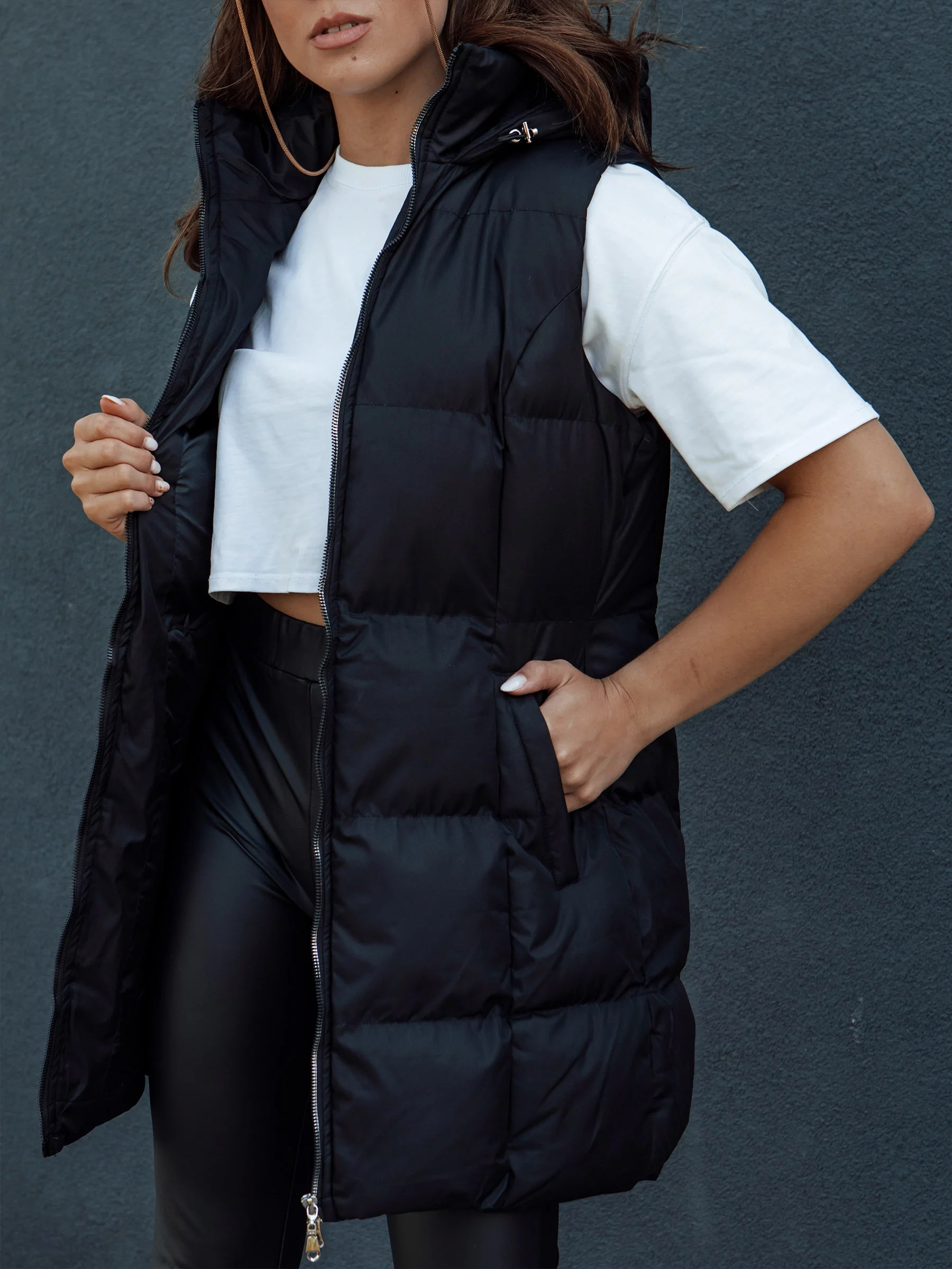Objevte nový rozměr stylu díky naší dlouhé prošívané vestě VIANA. Výjimečný design s kapucí a kapsami z ní dělá ideální volbu pro každou příležitost. Spoj ji s legínami a kotníkovými botami, aby vytvořila jedinečný vzhled, který přitáhne všechny pohledy. Dokonalá na chladnější dny, zajistí ti pohodlí a teplo. Investujte do módy, která nikdy nevyjde z trendů. Kup teď a užívej si eleganci každý den.