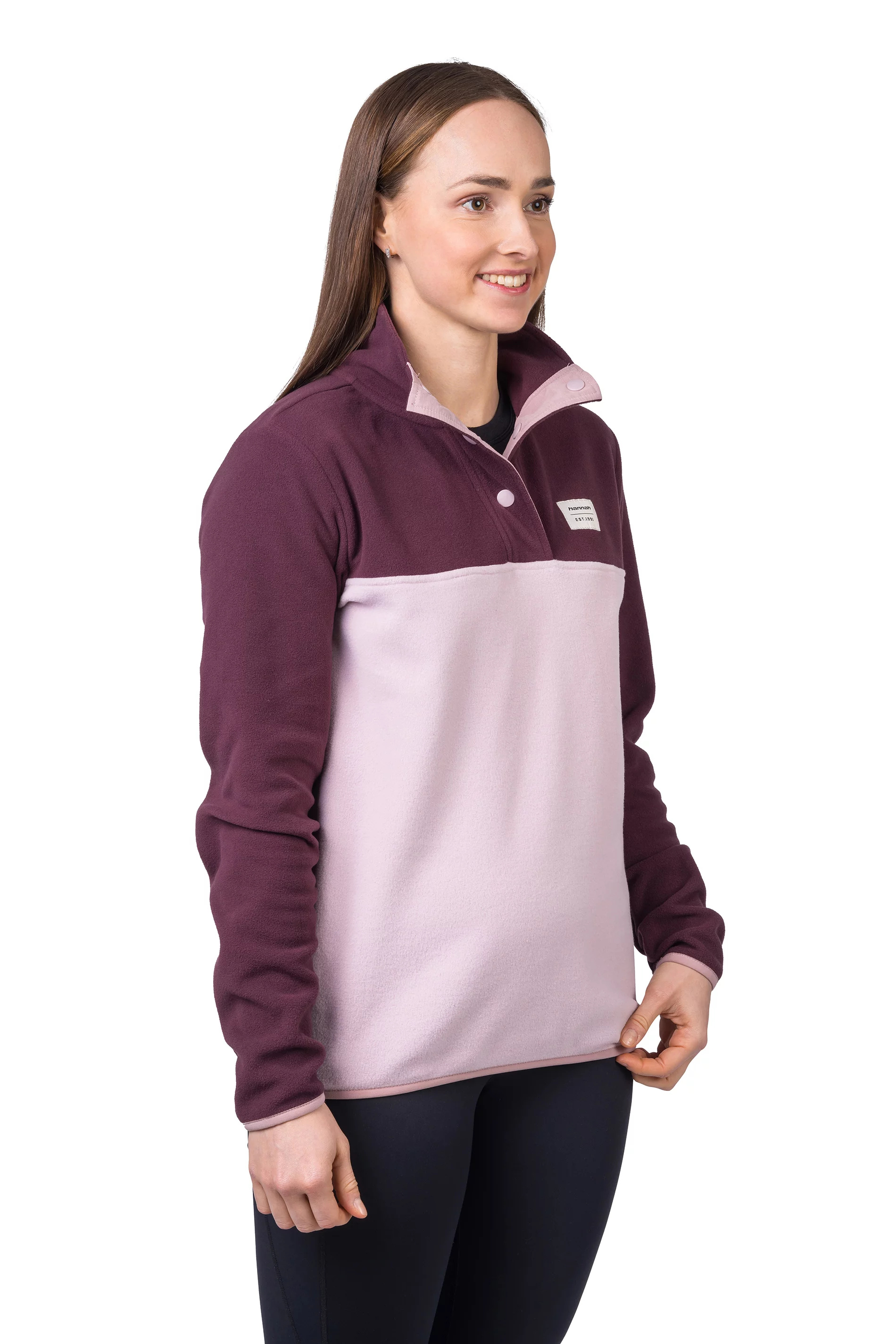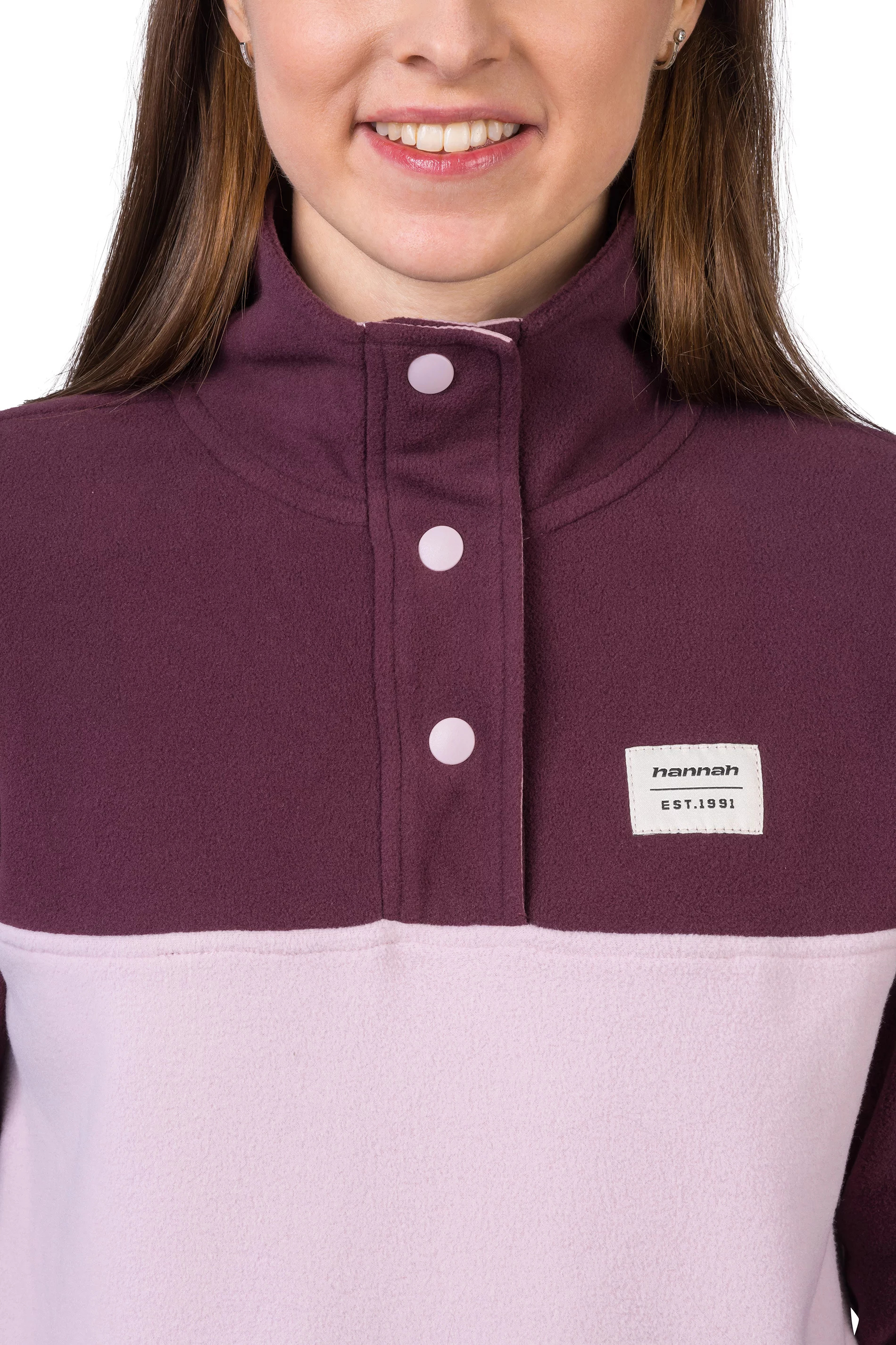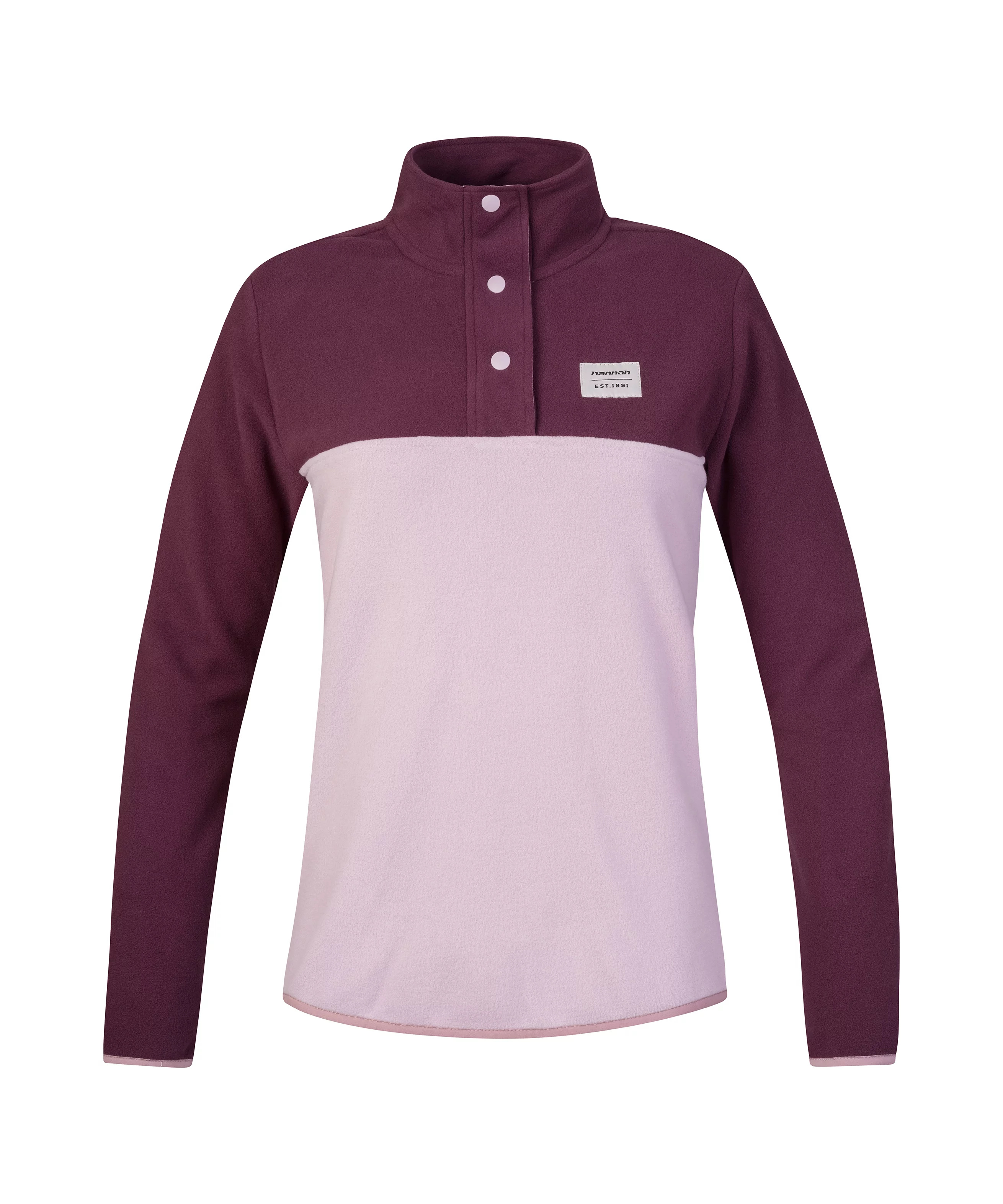Mikina z jemného, elastického a hřejivého fleece materiálu Polarsoft Micro, který má zároveň nízkou hmotnost a dlouhotrvající životnost. Střih řešený přes hlavu, částečné zapínání mikiny na patentky, které přechází do zvýšeného komfortního stojáčku. Anatomicky tvarované rukávy a spodní okraj jsou lemované gumou. Retro design a barevné členění čerpá z původních kořenů značky Hannah.