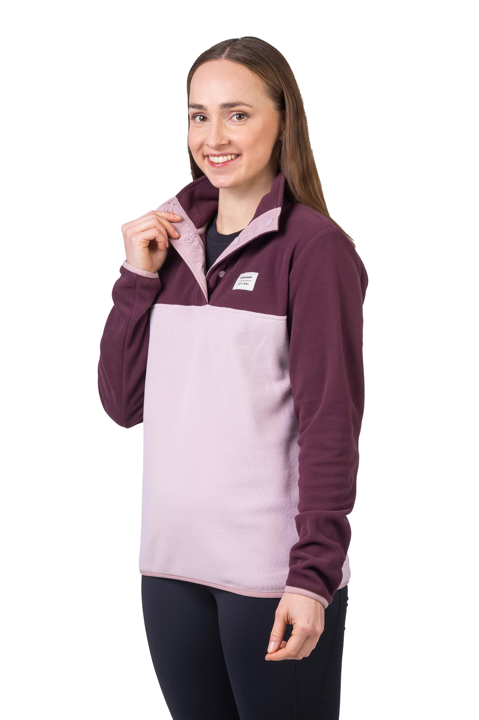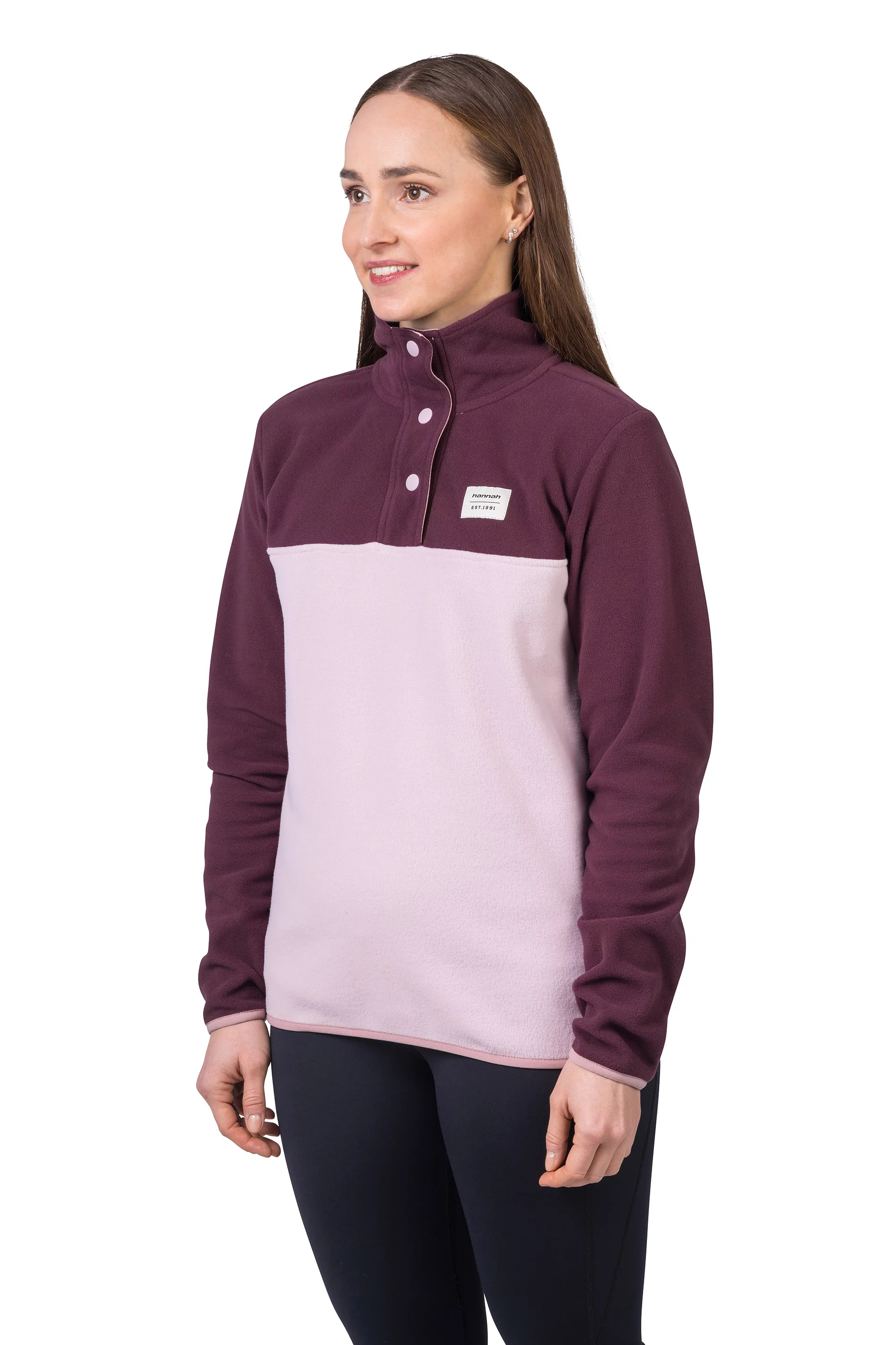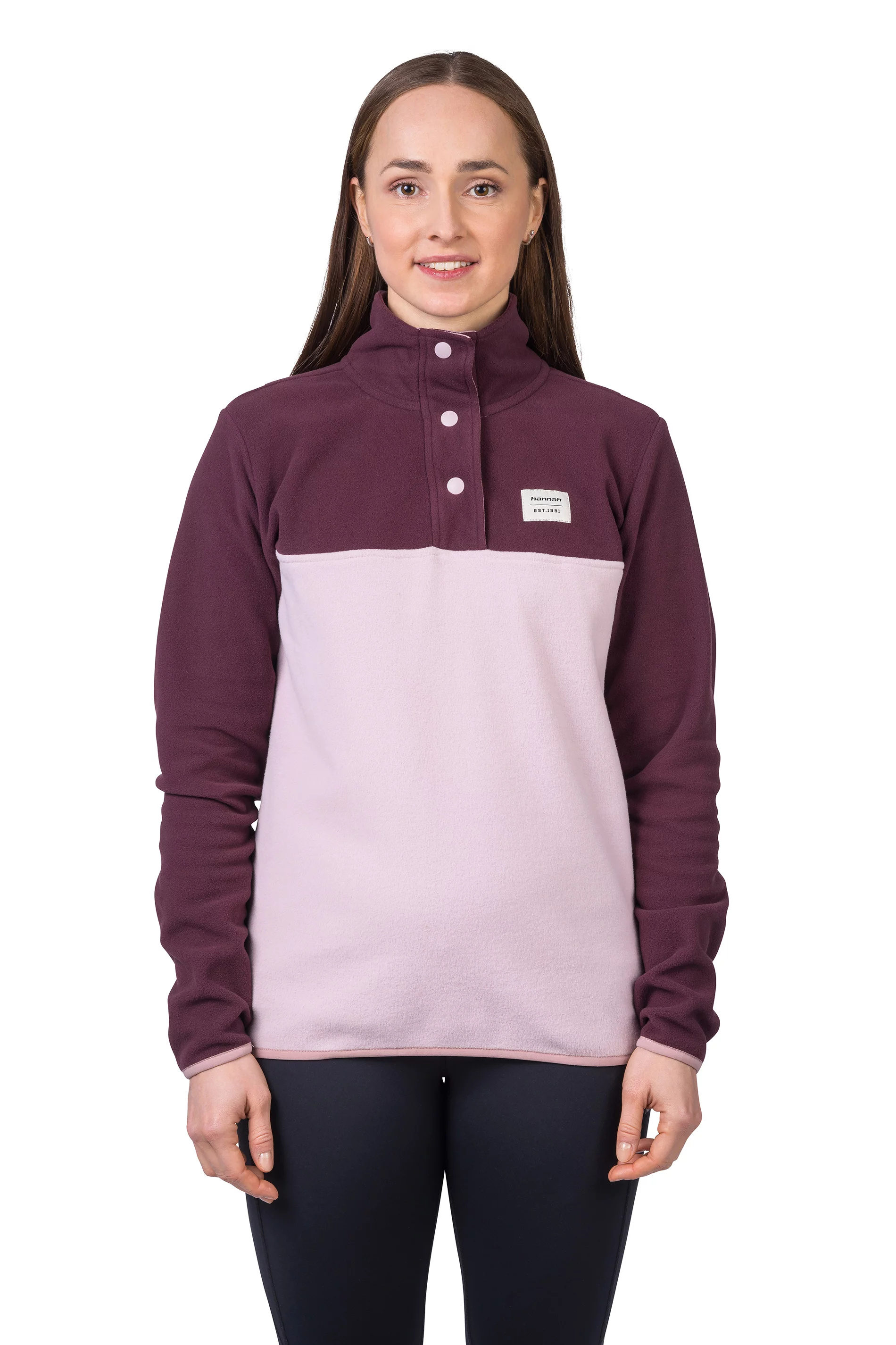 Mikina z jemného, elastického a hřejivého fleece materiálu Polarsoft Micro, který má zároveň nízkou hmotnost a dlouhotrvající životnost. Střih řešený přes hlavu, částečné zapínání mikiny na patentky, které přechází do zvýšeného komfortního stojáčku. Anatomicky tvarované rukávy a spodní okraj jsou lemované gumou. Retro design a barevné členění čerpá z původních kořenů značky Hannah.