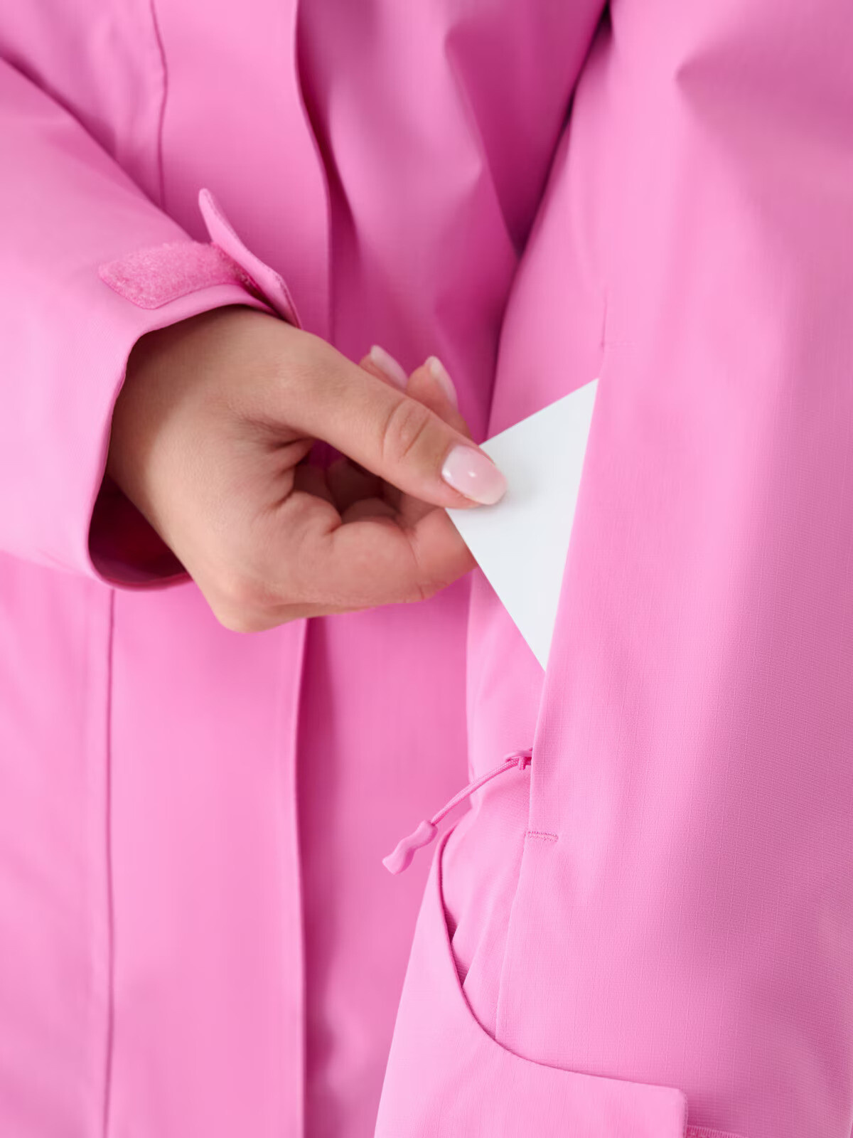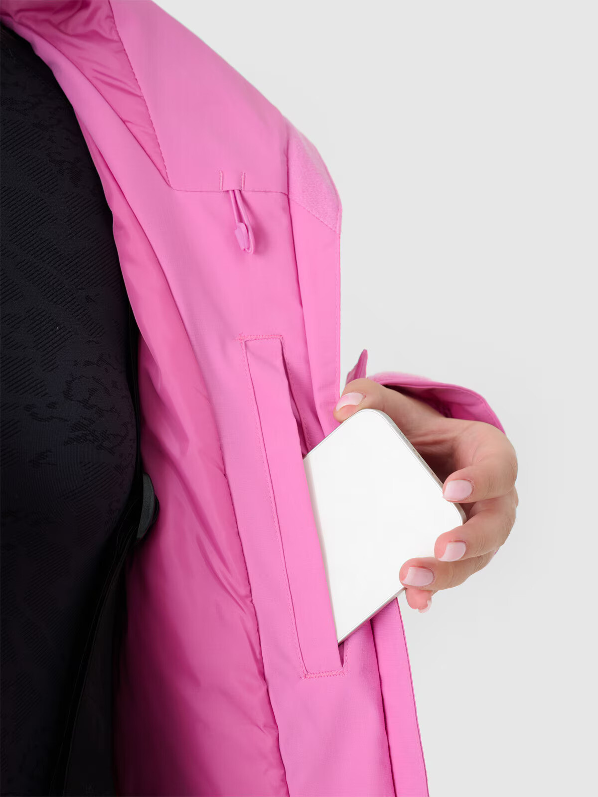 Dámská lyžařská bunda se zapíná na jednocestný hlavní zip s vnitřní a vnější větruodolnou légou, která omezuje pronikání chladu dovnitř bundy. Obvod spodní části lze upravit pomocí tunelové šňůrky se stopery. Celek doplňují reflexní prvky pro lepší viditelnost a integrovaný sněhový pás s nastavením obvodu pomocí patentek, což zabraňuje vniknutí sněhu dovnitř.