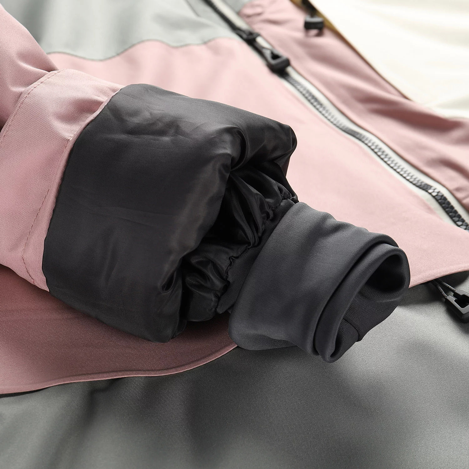 Odepínatelná sněhová manžeta, která zabraňuje pronikání sněhu pod oděv. Ve spodní části je našita elastická protismyková guma.