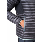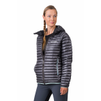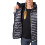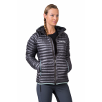 Dámská odlehčená péřová bunda s povrchovou úpravou materiálu proti nasákavosti. Pružné panely v podpaží umožňují uvolněný pohyb a komfort při nošení. Technologie komorového plnění obsahuje vysoce kvalitní kachní peří v poměru 80/20 s plnivostí 750cuin. Prachové kachní peří pochází z certifikovaných farem a zpracovává se v souladu s životním prostředím. Bunda poskytuje výborný tepelný komfort v kombinaci s nízkou váhou a sbalitelností do přiloženého transportního obalu. Svrchní lehký a pevný materiál Airlite DMF od japonského výrobce spolehlivě zabraňuje pronikání péřových vláken vně. Samozřejmostí u takového typu bundy je sportovní střih s anatomicky tvarovanými rukávy a zakončením dolního lemu, rukávů a kapucí pružným lemem. Odlehčené a flexibilnější YKK zipy a technicky výše umístěné hlavní kapsy přístupné při nošení sedáku či batohu. Bunda je vhodná jako svrchní tepelně izolační vrstva, v případě nepřízně počasí může výborně posloužit jako záložní druhá izolační vrstva pod nepromokavou bundu. Certifikace Bluesign je zárukou transparentnosti a využití zdrojů šetrných k životnímu prostředí při výrobě.