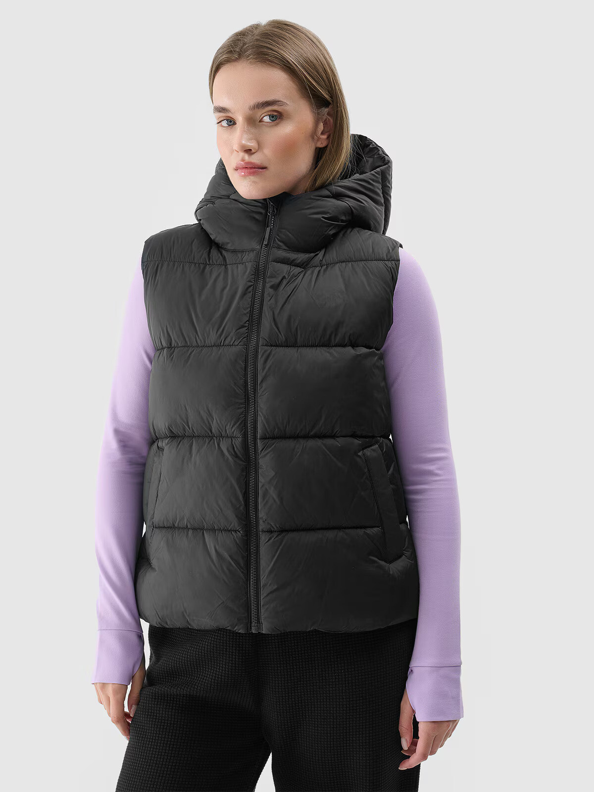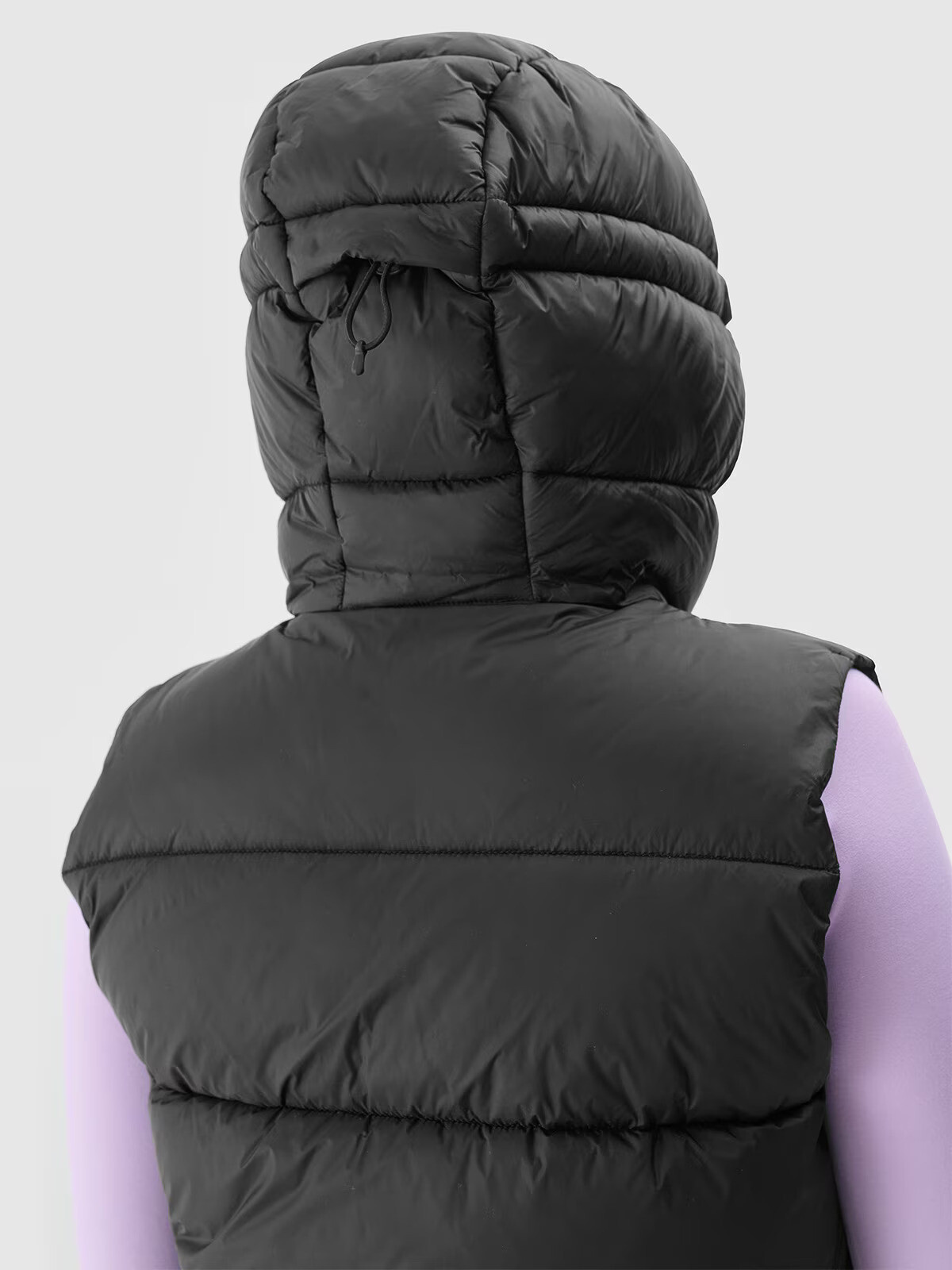Dámská péřová vesta s kapucí je vybavena integrovanou kapucí bez možnosti regulace. Krk je chráněn nízkým stojáčkem. Na bocích jsou 2 otevřené kapsy. Dámská péřová vesta se zapíná na jednosměrný hlavní zip a je vybavená vnitřní větruodolnou légou, která omezuje pronikání chladu dovnitř bundy. Obvod spodní části lze upravit pomocí tunelové šňůrky se stopery.