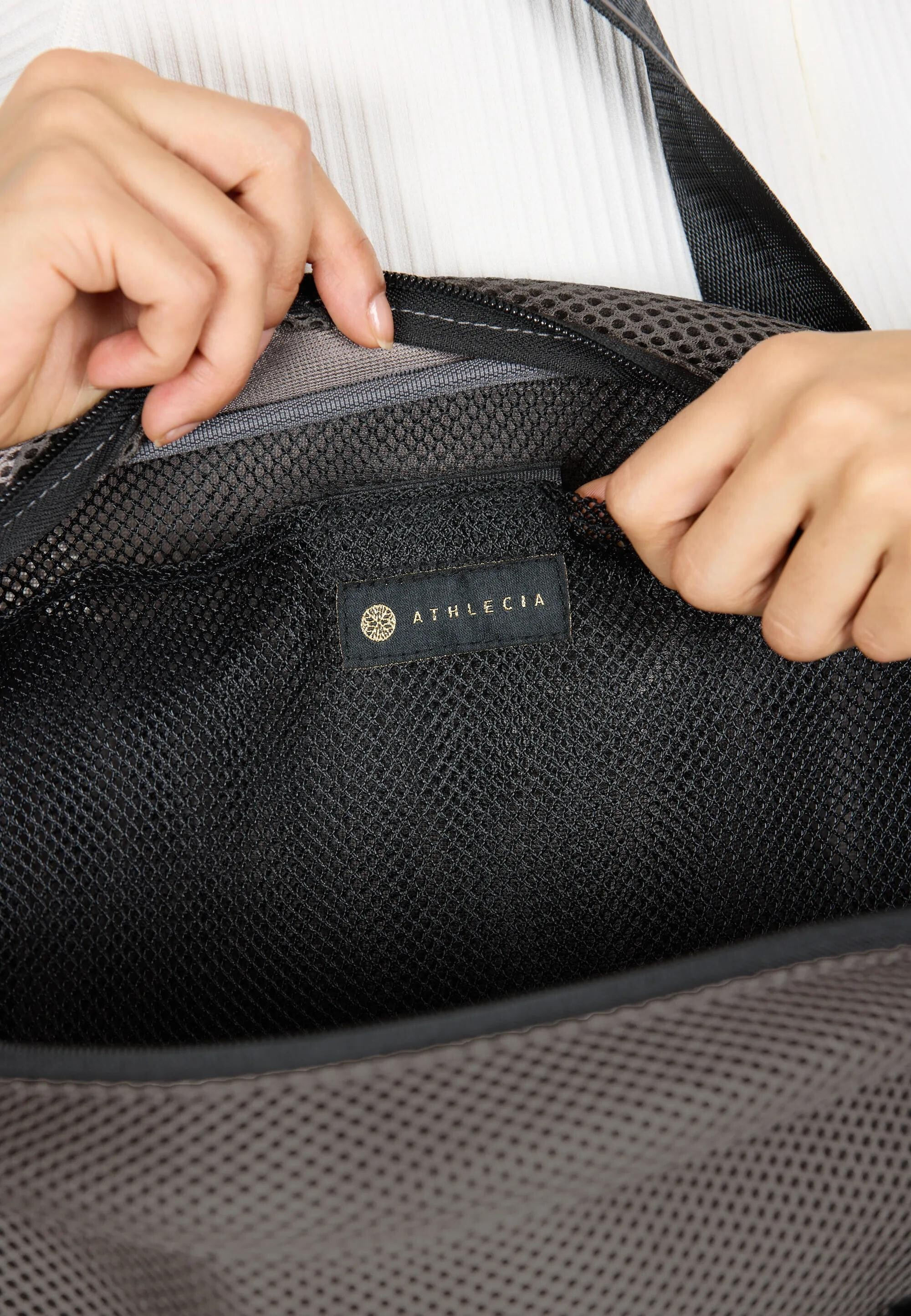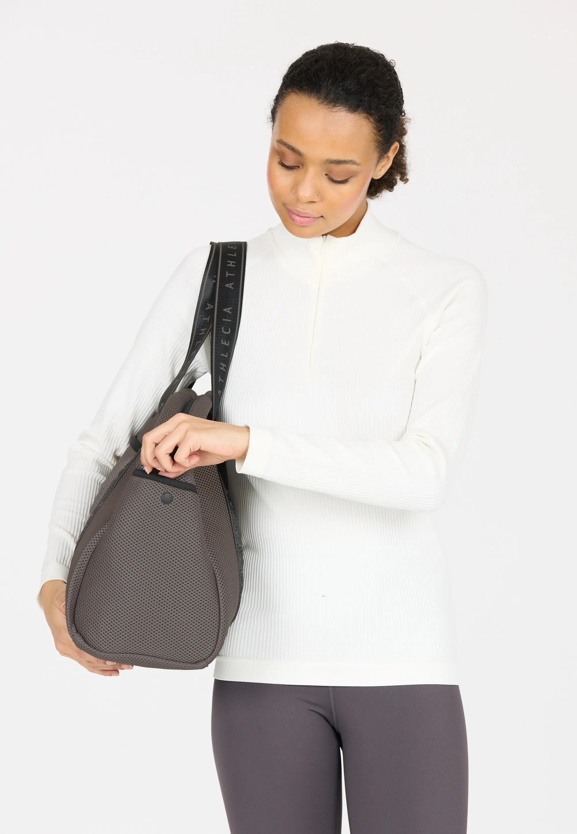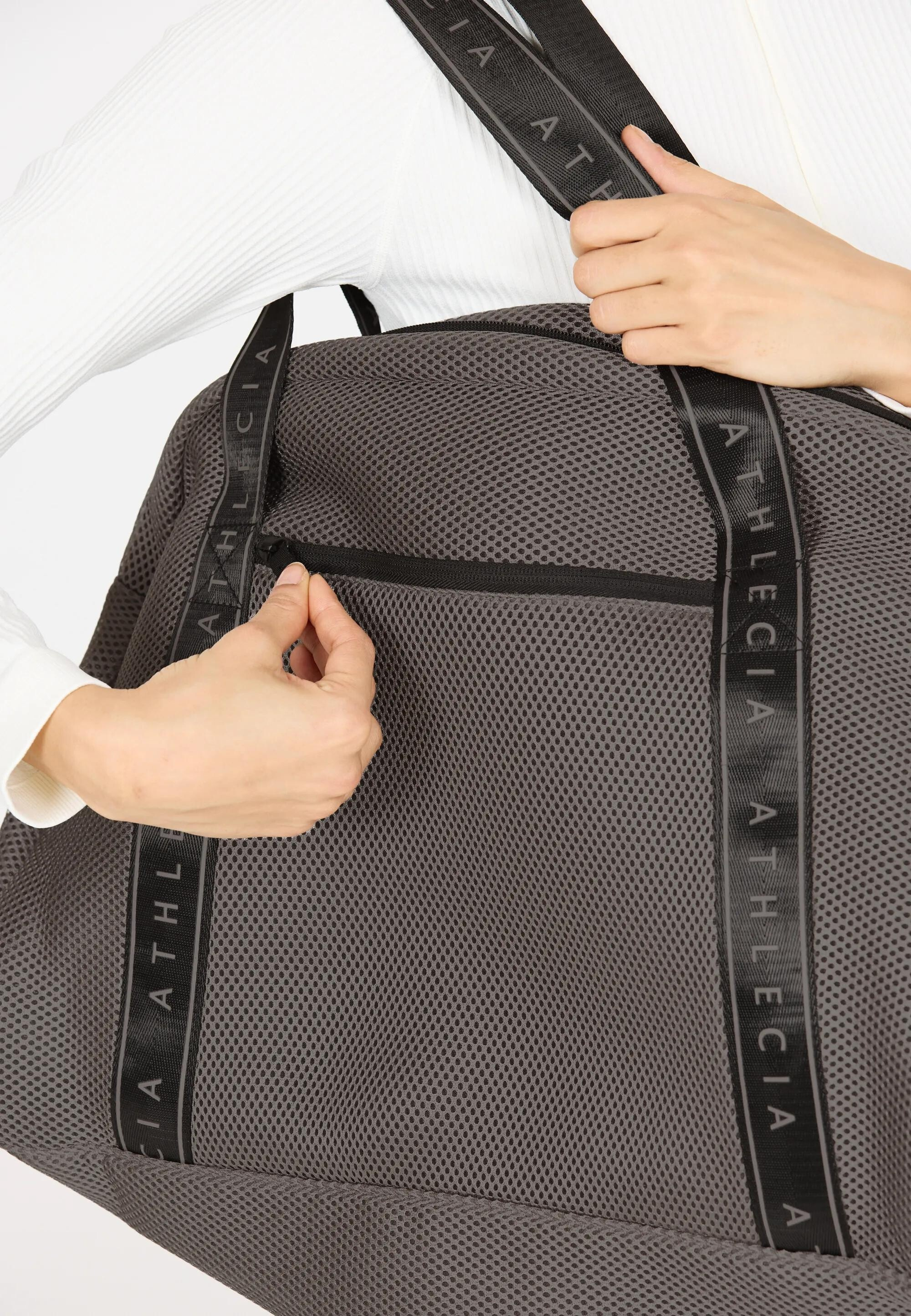 Dlouhá ucha s kontrastním logem ATHLECIA umožňují pohodlné nošení přes rameno i v ruce.