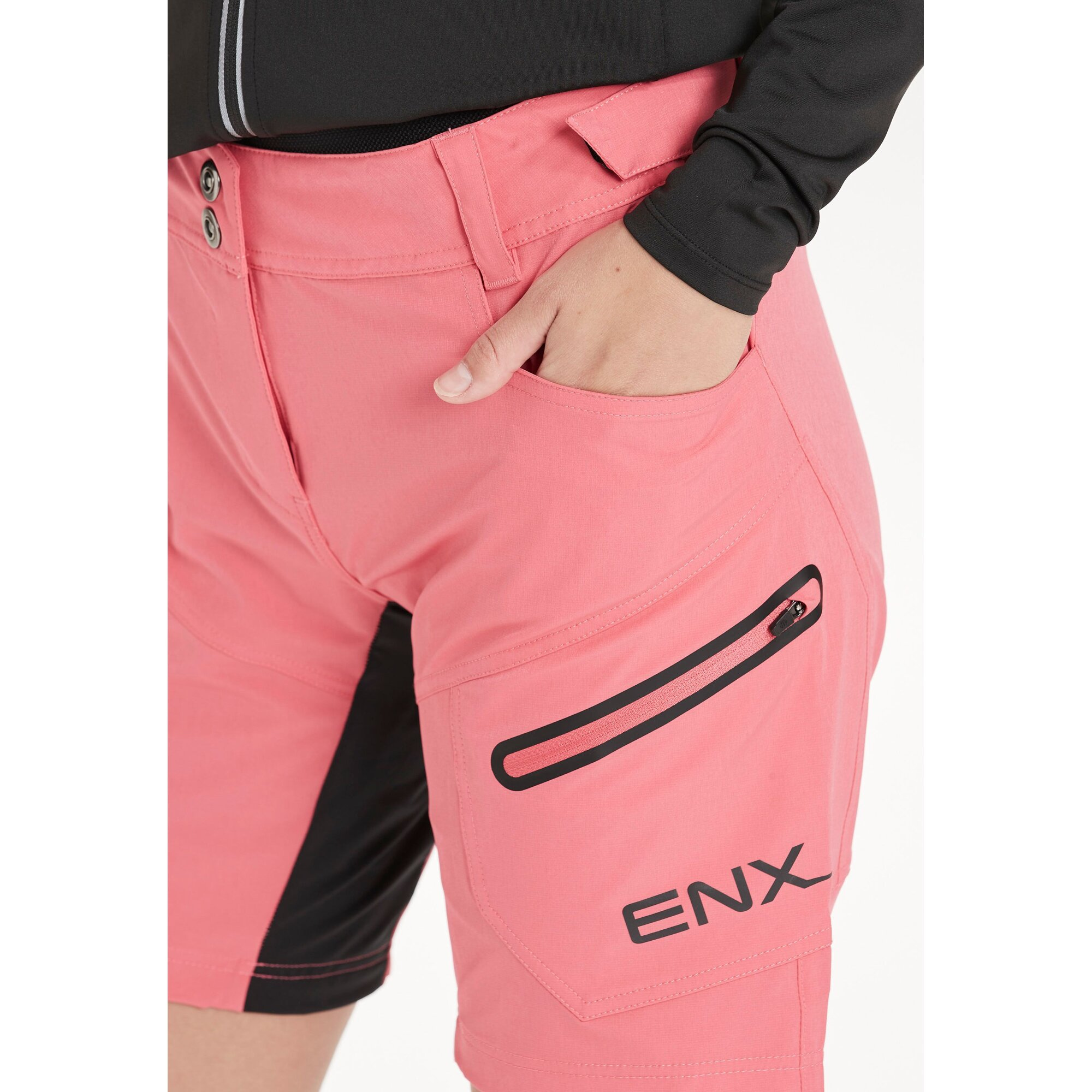 Dámské cyklistické šortky Endurance Jamilla jsou odolné, flexibilní a velice pěkné šortky, které vám poskytnou velkou svobodu pohybu na vašich vyjížďkách na kole. V pase jsou poutka na opasek a regulace na suchý zip, což umožňuje optimální přizpůsobení. Na levém stehně je navíc kapsa na zip, kam si můžete uložit své nejdůležitější cennosti.