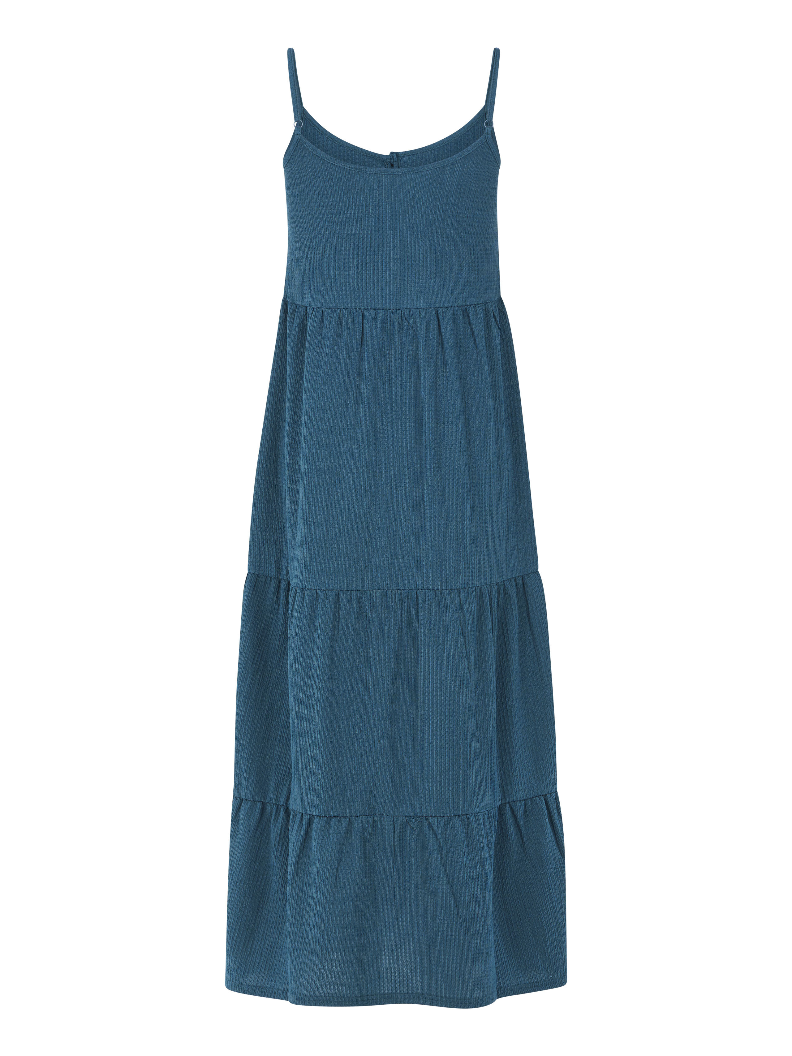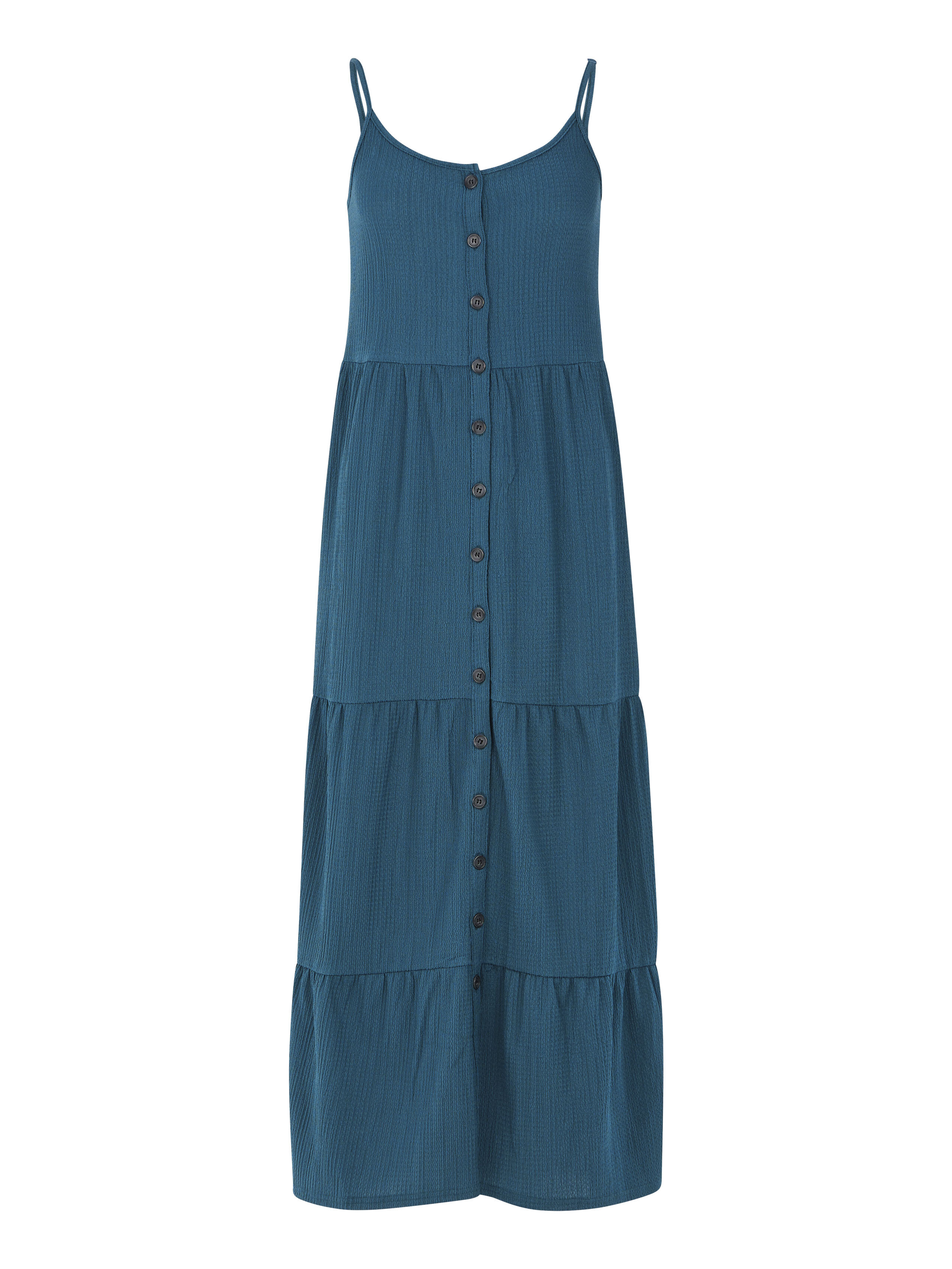 Tyto krásné letní šaty se špagetovými ramínky mají krásný výstřih a knoflíky na přední straně sahající až dolů.