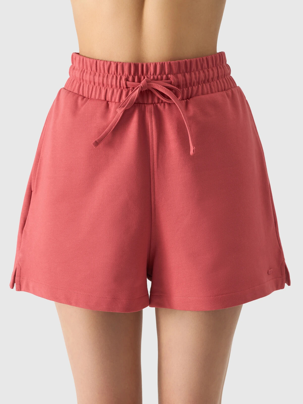 Dámské teplákové šortky jsou vyrobeny z pleteniny se střední gramáží 280 gsm, díky čemuž jsou měkké a prodyšnější. Šortky nemají podšívku, takže jsou lehčí. Na bocích jsou 2 otevřené kapsy. Elastický pás s vnějším nastavením na šňůrku.