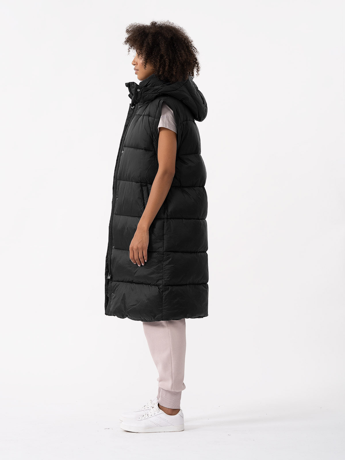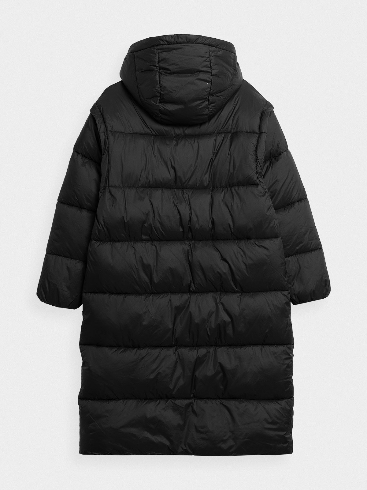 Dámský péřový kabát v oversize střihu s výplní ze syntetického peří poskytuje větší tepelný komfort a chrání záda a stehna. Zimní bunda má také velkou odnímatelnou kapuci a vysoký límec. Dvoucestný zip usnadní přizpůsobit spodní část kabátu, např. při jízdě autem. Díky odepínacím rukávům lze kabát proměnit v dlouhou vestu. Impregnovaný z vnější strany materiál podporuje ochranu proti nadměrné absorpci vlhkosti.
