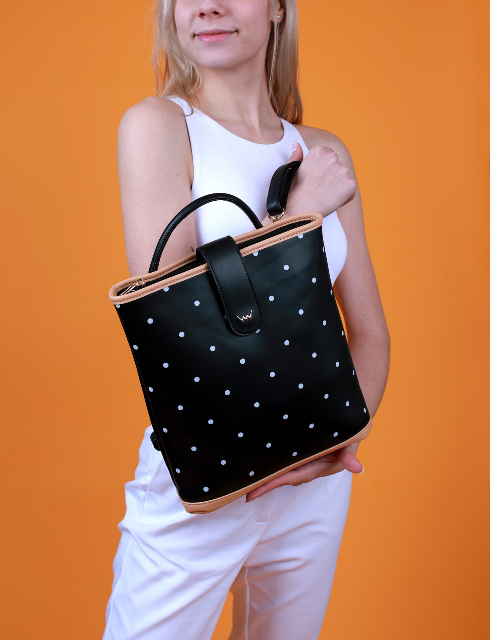 Crosta je krásnou ukázkou toho, že elegance může být pořádně šmrncovní záležitostí. Černý batoh s béžovým lemováním jsme totiž ozdobili našimi oblíbenými puntíky. Crostu tak můžeš nosit kamkoliv si umaneš. Ať už jako batůžek nebo crossbody kabelku.