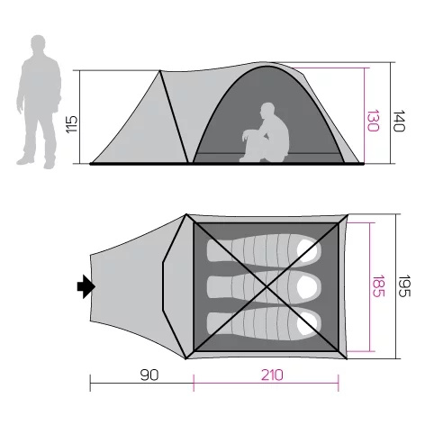 Prostorný a přitom sbalitelný stan pro 3 osoby, 1 vchod, vnitřní konstrukce, 1 ložnice, předsíň s čelním vchodem, 3 pruty, 2 větrací otvory, klasické ukotvení prutů, s uchycením tropika pomocí háčku, dveře s částečným odvětráním, 2 kapsy, stropní odkládací polička, kovové kolíky.