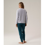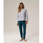 Ta piżama damska to idealna propozycja na chłodne, jesienno-zimowe noce. Luźna bluza typu longsleeve ma okrągłe wycięcie przy szyi, długie rękawy bez ściągaczy oraz niewielkie logo ATLANTIC, obok którego znajduje się wyhaftowana gałązka. Spodnie mają delikatnie zwężające się ku dołowi nogawki i praktyczne kieszenie po bokach.