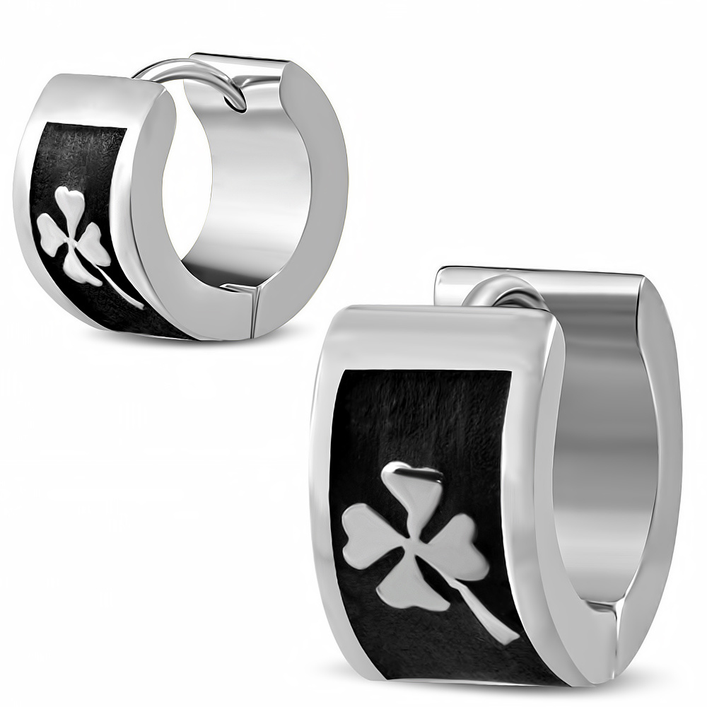 Náušnice chirurgická ocel - kroužky černý čtyřlístek