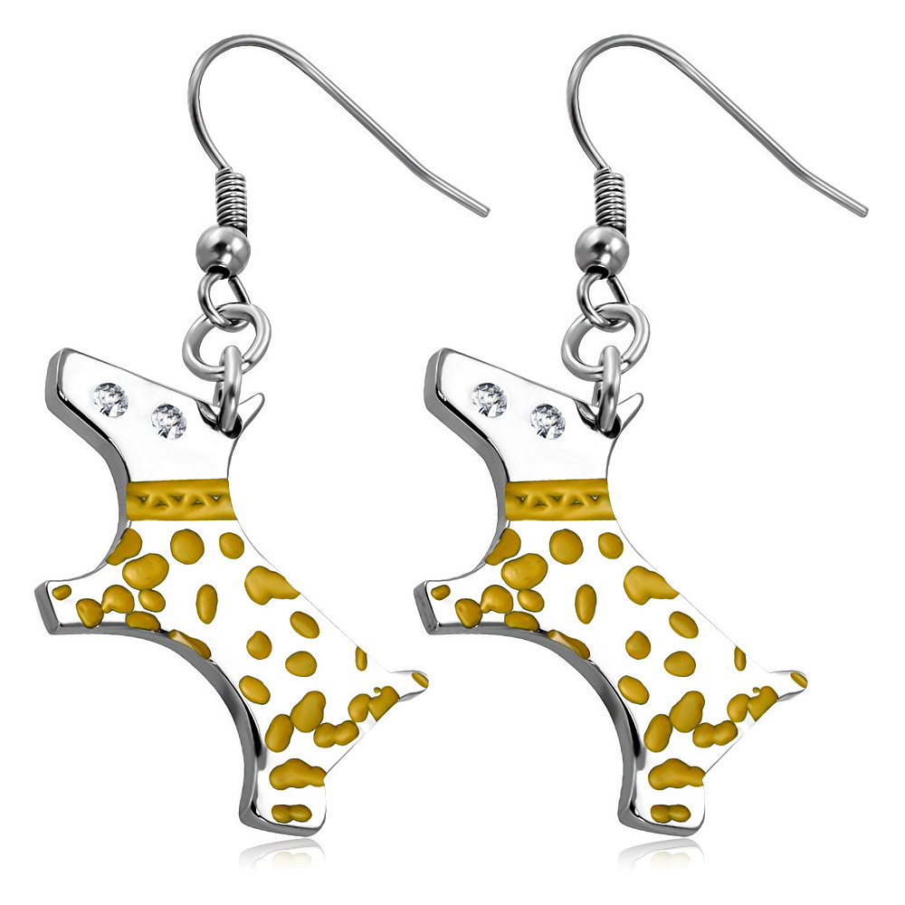 Náušnice z chirurgické oceli, které jsou v podobě psíka ve zlato-stříbrné barvě.Druh šperku: Náušnice Materiál: Chirurgická ocel Určení: Dámské náušnice Typ: Visací náušnice Rozměr náušnic: 4 x 1, 5 cmChirurgická ocel je skvělý materiál pro náušniceVybrat si náušnice z chirurgické oceli je dobrá volba. Chirurgická ocel je odolnější narozdíl od jiných vzácných kovů a vydrží i o něco horší zacházení. Velkou výhodou je, že nečerná, je barevně stálá a drží si svůj lesk dá se říci navždy. Navíc pro zákazníky, kteří mají na vzácné kovy alergii jsou ocelové náušnice jasnou volbou. Počítejte s tím, že chirurgická ocel má šedý odstín, pokud nemá další povrchovou úpravu.Starejte se o své náušnice dobře Chirurgická ocel je sice odolnější než jiné kovy, neznamená to, že šperk z tohoto materiálu nepotřebujepéči. Stačí dodržovat určité zásady.Ocelové náušnice ani jiný šperk do vody nepatří. Je vhodné si je sundat před koupáním. Chlor ani jiné látky (čistící prostředky) nepůsobí na povrch kovu dobře. Pokud na to zapomenete, není důvod k panice, stačí vzít hadřičku a osušit. Náušnice nenecháme dřít o povrch jiných šperků. Vznikají pak na povrchu mikroškrábanečky, které snižují lesklost kovu a estetický dojem. A na špercích právě milujeme jejich lesk nebo ne? Použijte stojánek na šperky, kde si své cennosti pěkně vystavte. Nevystavujte své náušnice byť z chirurgické oceli, mechanickému tlaku. Žádnému kovu také neprospívá lak na vlasy. Je třeba prvně upravit vlasy a poté náušnice nasadit.