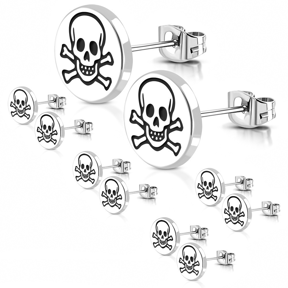 Malé peckové náušnice z oceli s lebkou.Materiál náušnic: Chirurgická ocel Průměr pecek: 10 mm