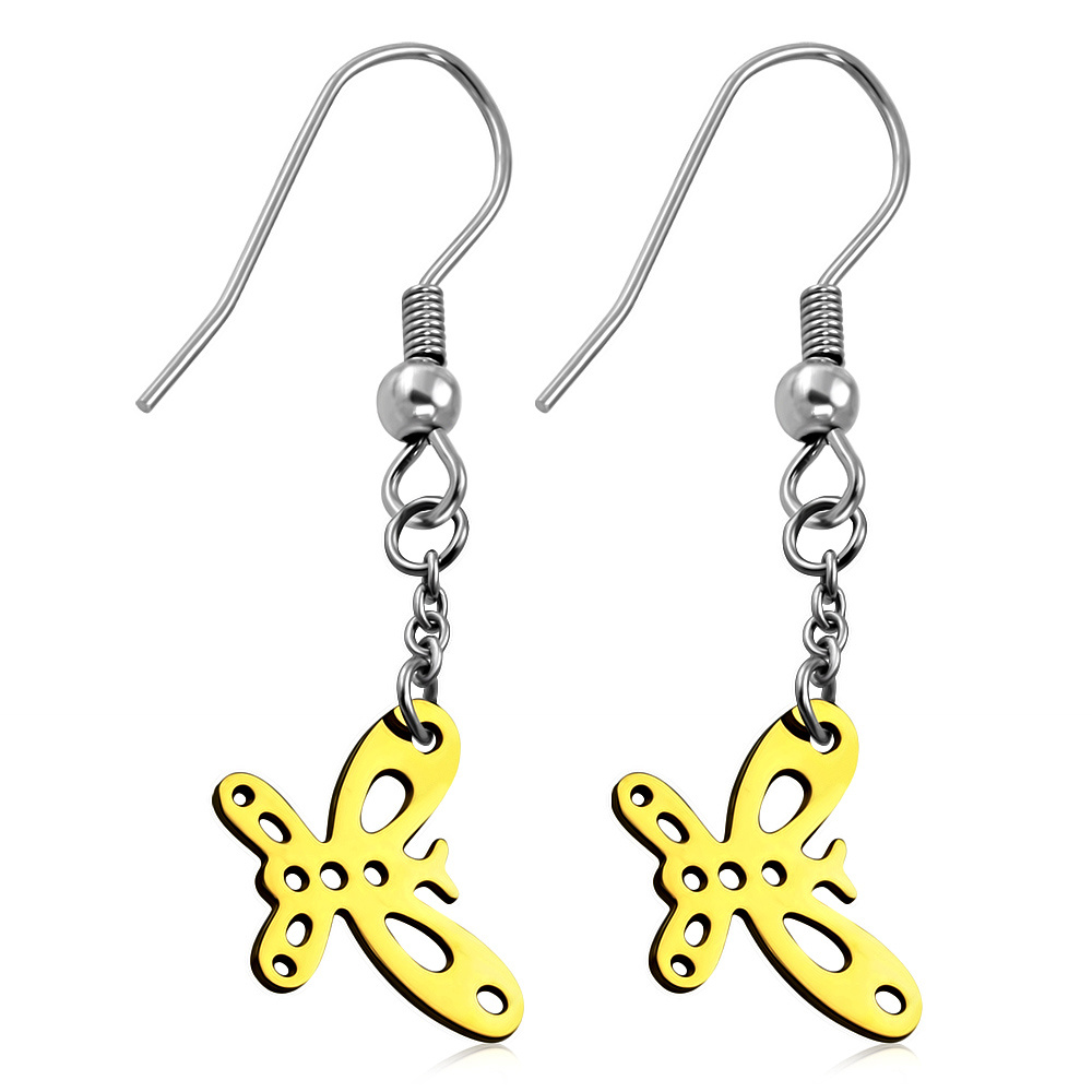 Další visací náušnice z chirurgické oceli v podobě motýla ve zlatém barevném provedení. Úžasný šperk z chirurgické oceli, který bude jedinečný a nikdy nezevšední. Rozměry: 1,4 x 4cm.Druh šperku: Náušnice Materiál: Chirurgická ocel Určení: Dámské náušnice Typ: Náušnice visací Rozměr náušnic: 1,4 x 4 cm