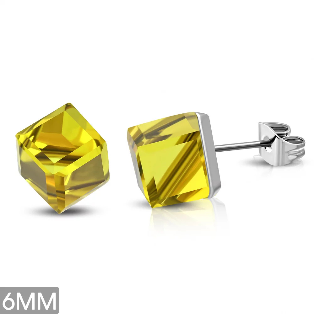 Malé ocelové náušnice v podobě kostiček ve žluté sluneční barvě.Druh zboží: Náušnice Materiál: Chirurgická ocel Určení: Dámské náušnice Typ náušnic: Pecky Rozměr náušnic: 6 mm