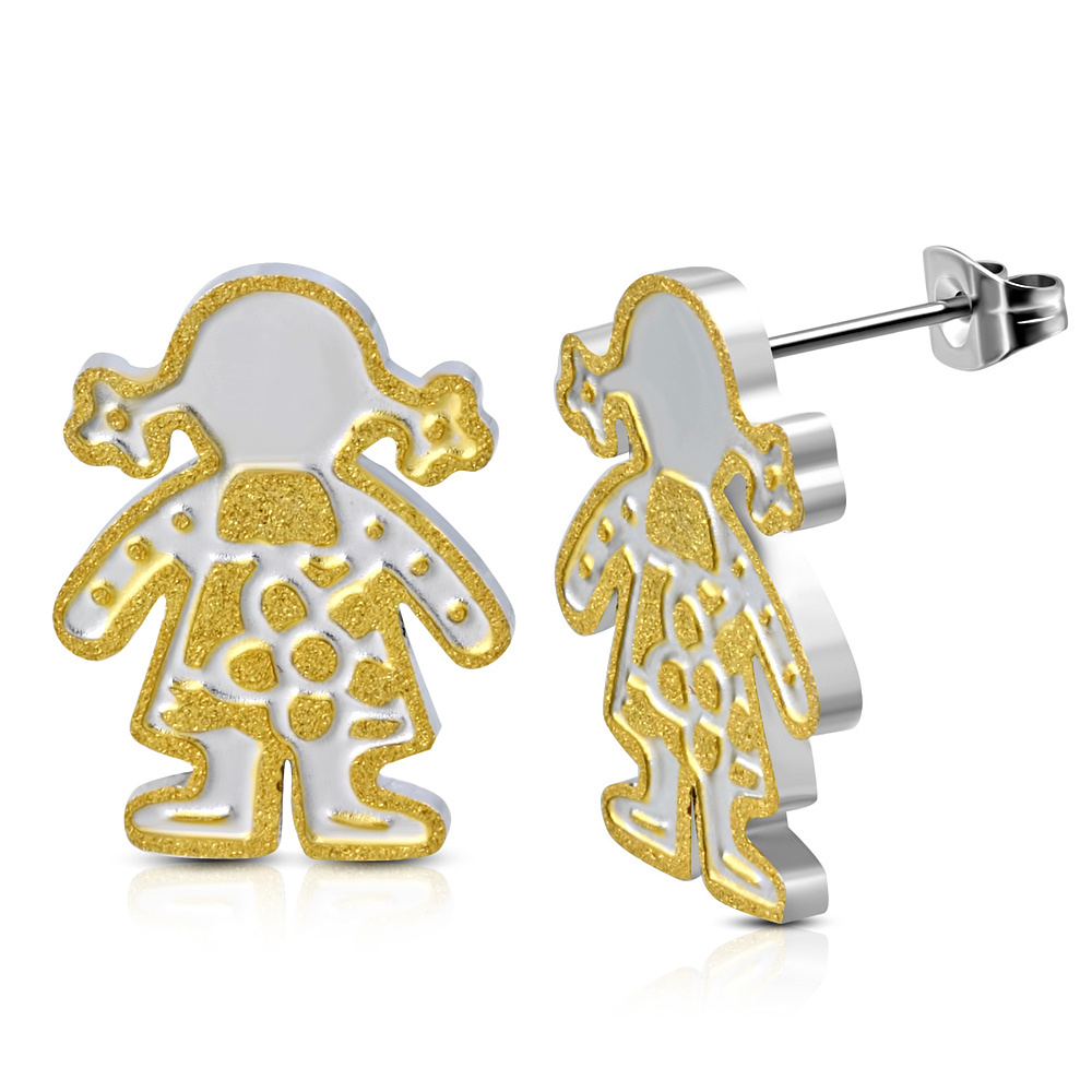 Kupte si tyto krásné a zajímavé ocelové náušnice v podobě pecek. Náušnice jsou ve tvaru postavičky, která je částečně zlaté barvy. Zajímavá kombinace co myslíte? Rozměry náučnic: 1,2 x 1,7.Druh šperku: Náušnice Materiál: Chirurgická ocel Určení: Dámské náušnice Typ: Náušnice pecky Rozměr náušnic: 1,2 x 1,7 cm