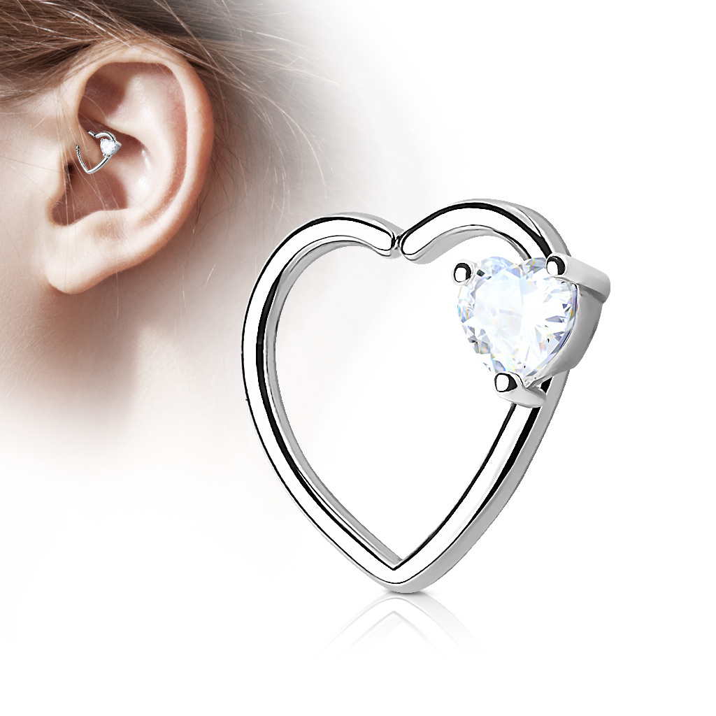 Ocelový piercing do levého ucha - srdce s čirým kamínkem