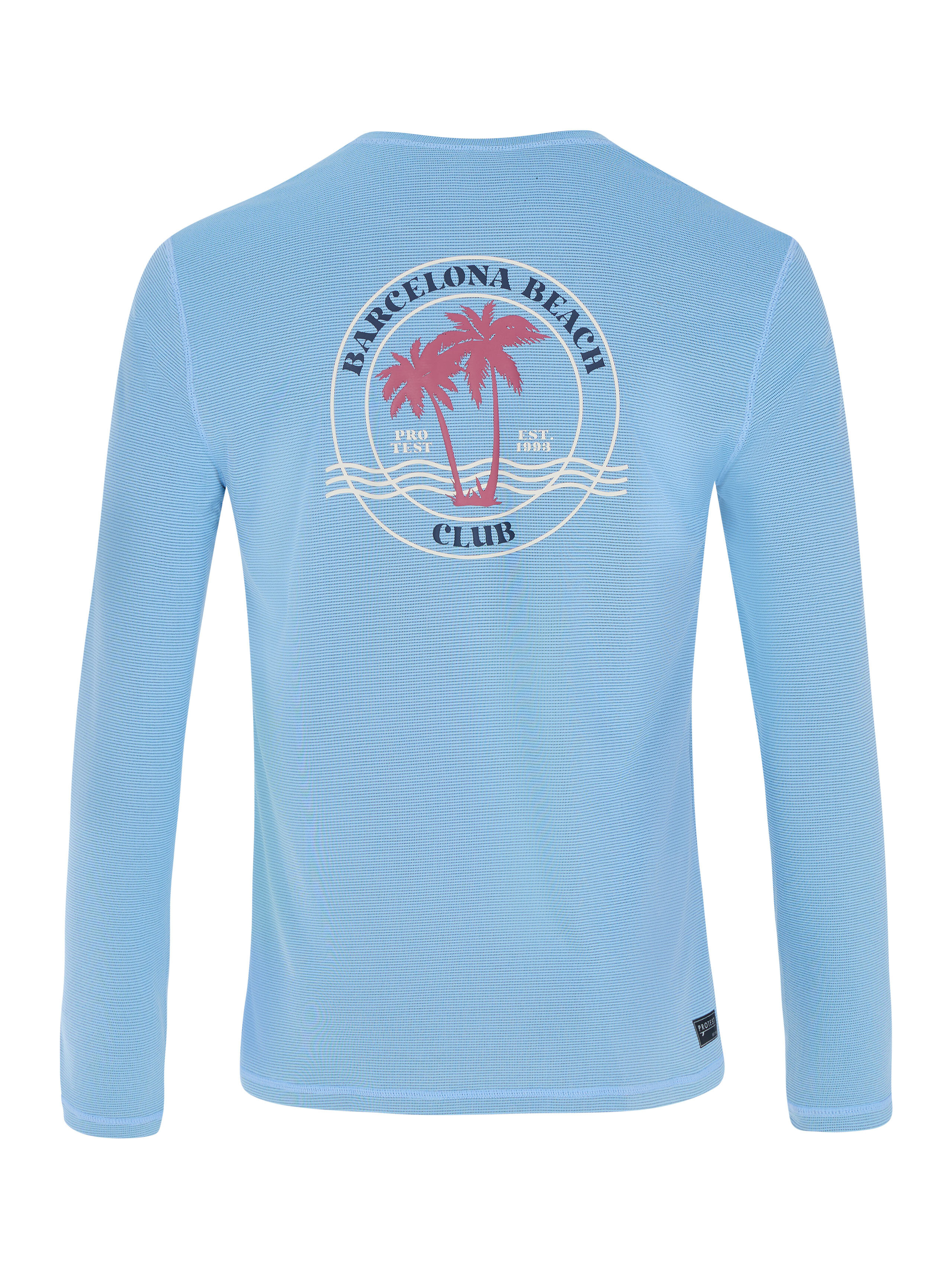 Decentní logo na hrudi a velký potisk na zádech přinášejí sportovní plážovou atmosféru.