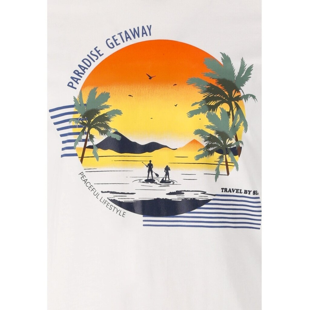 Dominantním prvkem je barevný potisk na hrudi s motivem západu slunce, palem a paddleboardistů, doplněný texty „PARADISE GETAWAY“, „PEACEFUL LIFESTYLE“ a „TRAVEL BY SEA“. Tento design navozuje atmosféru klidu, dobrodružství a letního volného času.