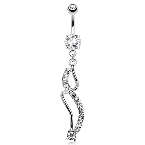 Příjemně dlouhý piercing do pupíku z chirurgické oceli ve tvaru spirály. Zdobí jej velké množství čirých třpytivých zirkonů.Materiál: Chirurgická ocel Rozměry: cca 30 x 7 mm