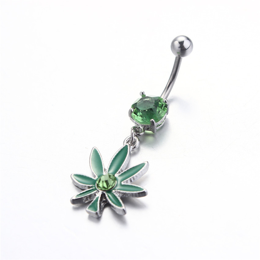 Piercing do pupíku z chirurgické oceli s přívěškem listu marihuany.