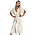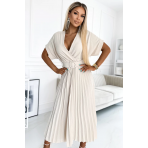 Plisované midi šaty s výstřihem a širokým páskem Numoco FELICIA - béžové Velikost: UNI