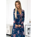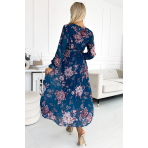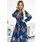 Plisované šifonové dlouhé šaty s výstřihem, dlouhými rukávy a páskem Numoco - modré s květinami Velikost: UNI