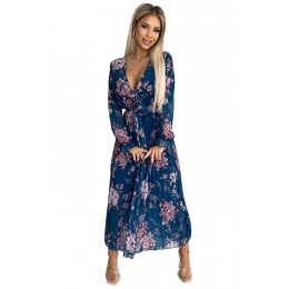 Plisované dlouhé šaty s psaníčkovým výstřihem, dlouhými rukávy a páskem na zavazování. Vyrobeno ze šifonového materiálu s podšívkou. Vzor: květiny na modrém pozadí. Perfektní šaty pro každou příležitost.