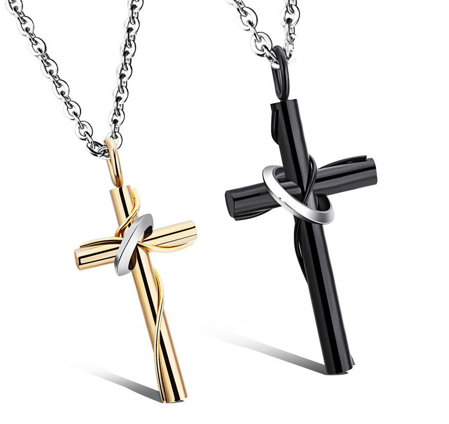 Přívěsky z chirurgické oceli v podobě křížků proložených kroužky.Rozměry černého přívěsku: 40 x 21 mm, Rozměry zlatého přívěsku: 30 x 16 mm