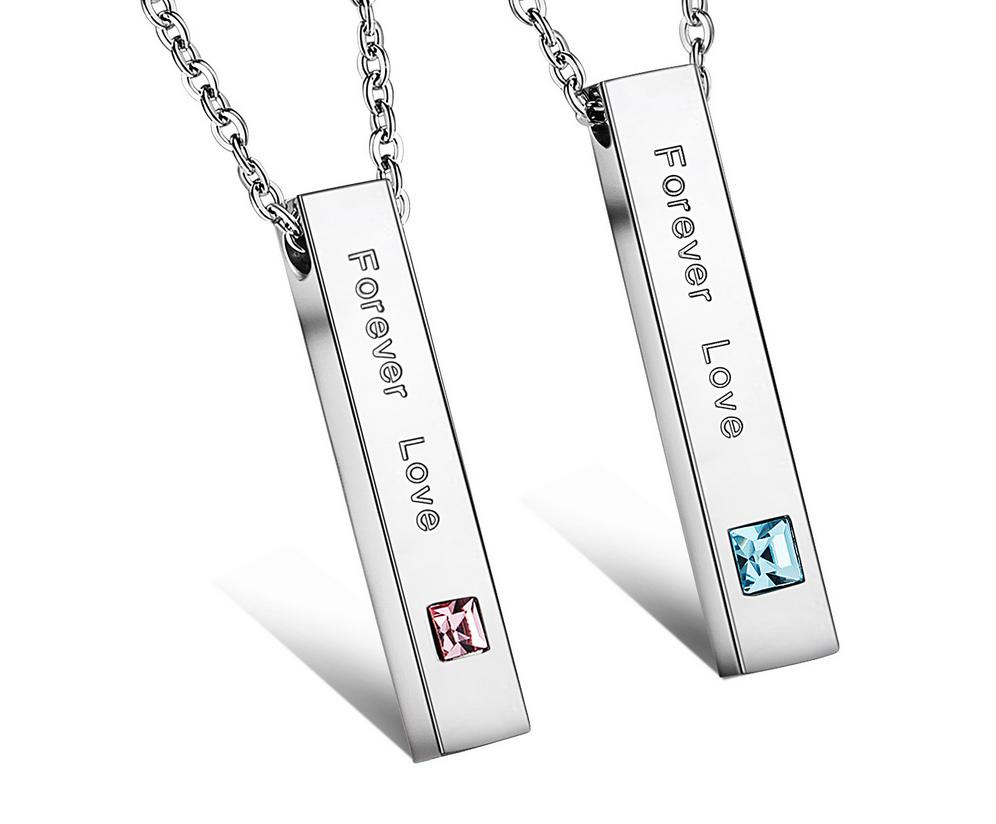 Nerezové přívěsky v podobě obdélníkových bloků se zirkony.Oba jsou stříbrné s modrými kubickými zirkony a růžové.Vesla nesou slova „Forever Love“.Velikost pánského přívěsku: 37 mm x 7 mm, Velikost dámského přívěsku: 31 mm x 6 mm.