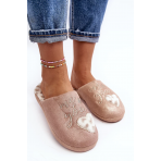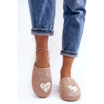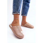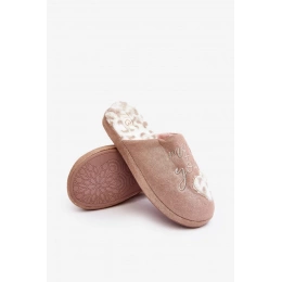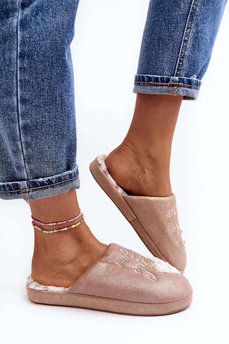 Lesklé dámské pantofle zdobené nápisem a srdíčkem. Nazouvací model se zakrytou špičkou. Nasazeno na tlusté podrážce. Vložka je zateplená kožíškem.Při výběru velikosti se prosím řiďte tabulkou velikostí.