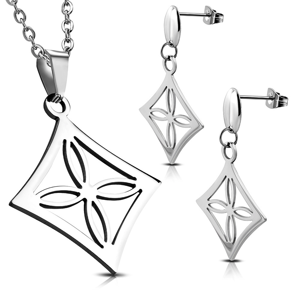 Souprava náušnic a náhrdelníku z oceli - kosočtverec s květinou
