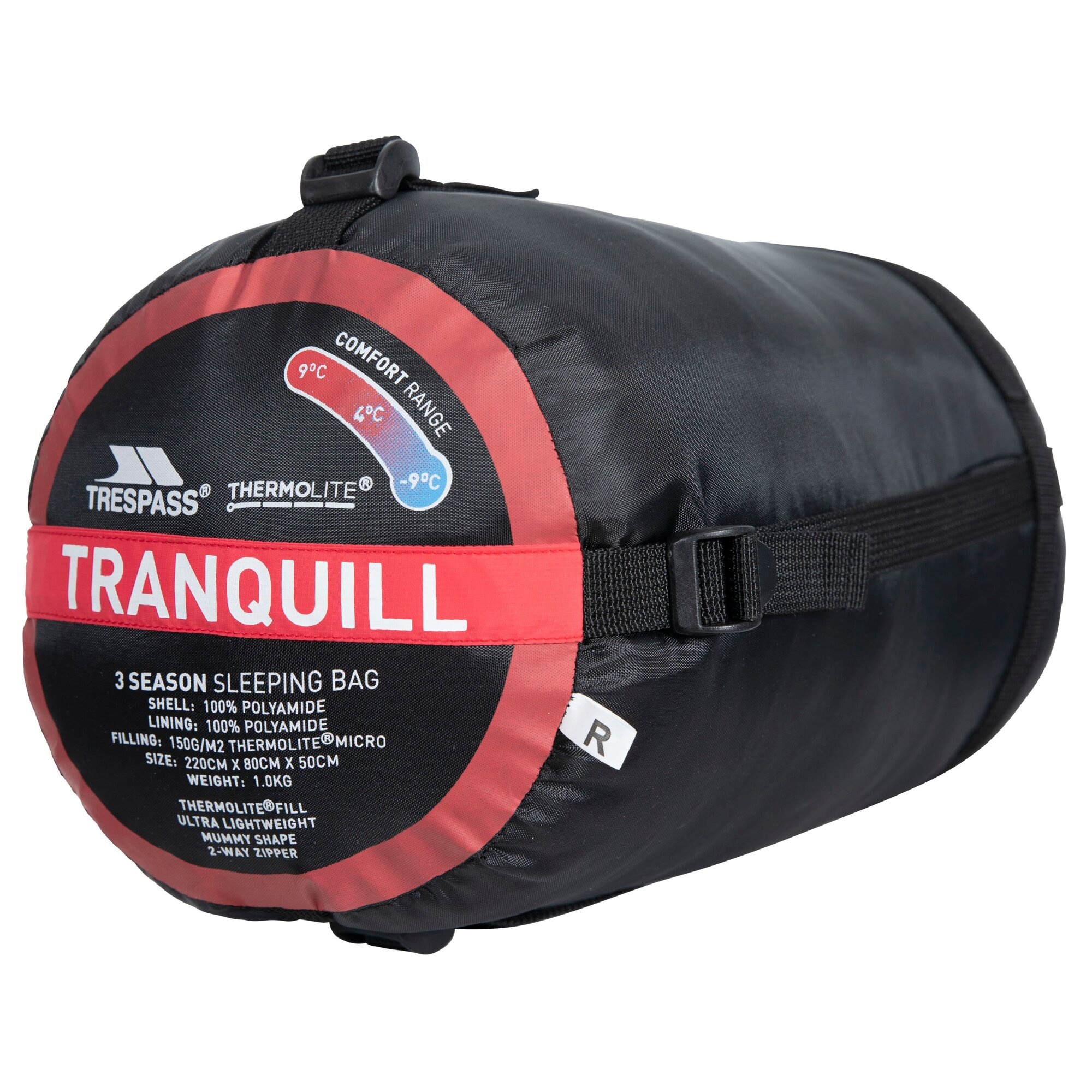 Tento spacák Trespass Tranquill je odborně zpracován z odolného, voděodolného materiálu s technologií výkonu Thermolite ve tvaru mumie. Obsahuje dvoucestný zip, ramenní manžetu a je vhodný pro použití po 3 roční období s horním limitem 9 °C a dolním limitem -9 °C.
