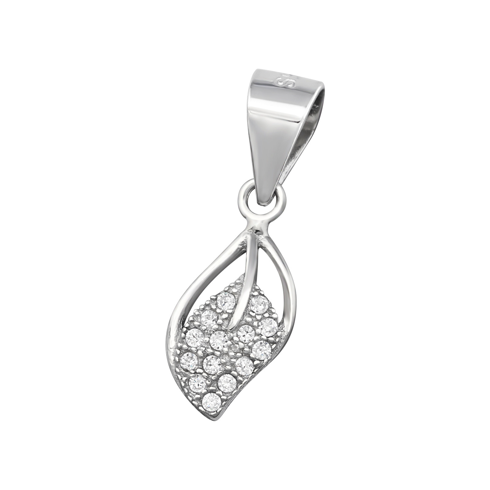 Stříbrný přívěsek ve tvaru lístku, který je ozdoben malými zirkony.Materiál: Stříbro 925 Rozměr: 6 x 10 mm V balení: pouze přívěsek