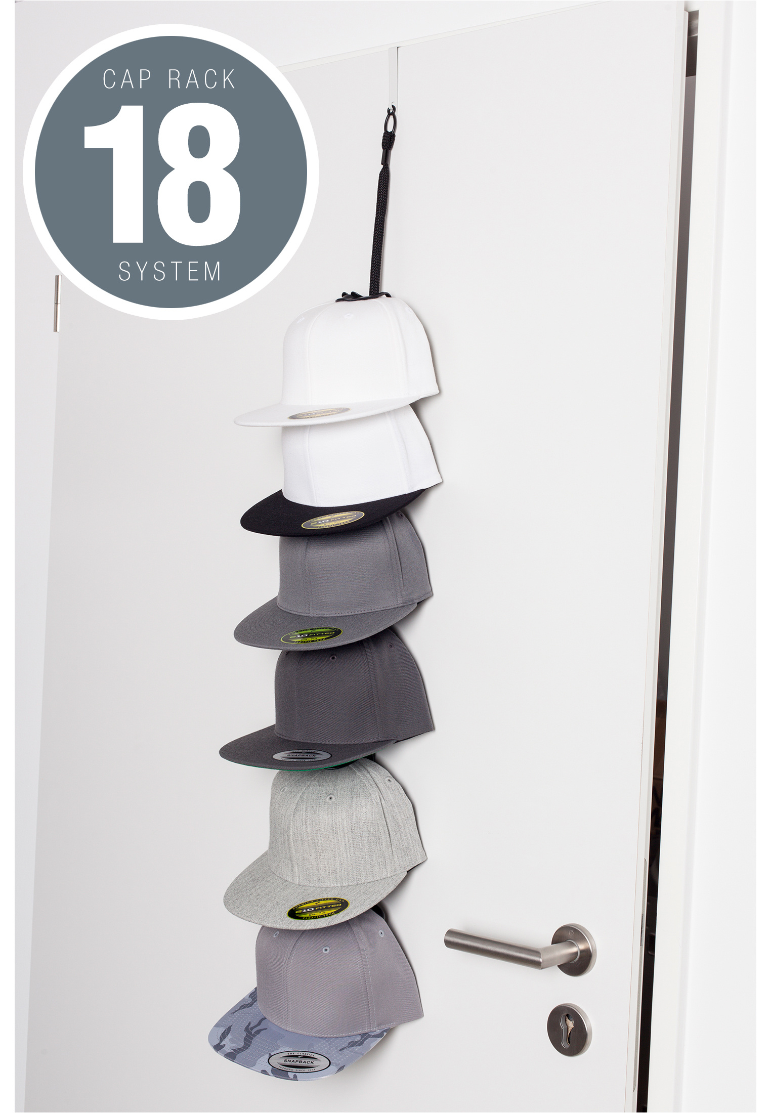 Systém CapRack 18 je nejpokročilejší systém zobrazení, organizace a úložiště, jaký byl kdy vyvinut. Zobrazte 6 čepic a zároveň uložte dalších 12 hned za ně, celkem tedy 18 čepic.Systém CapRack 18 lze zavěsit na dveře, na zeď, zavěsit na tyč šatní skříně – dokonce i zavěsit ze stropu jako mobil. Ideální pro nositele čepic a sběratele podobně, lze jej použít v obývacím pokoji, ložnici, pracovně, garáži, koleji – kdekoli, kde se chcete pochlubit nebo uložit čepice.Sada obsahuje 6 svorek a 3stopý kabel v černé barvě plus montážní materiál.Vzdálenost mezi čepičkami lze individuálně upravit.